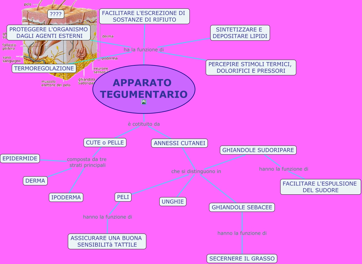 Questa Cmap, creata con IHMC CmapTools, contiene informazioni relative a: APPARATO TEGUMENTARIO, GHIANDOLE SEBACEE hanno la funzione di SECERNERE IL GRASSO, APPARATO TEGUMENTARIO ha la funzione di PROTEGGERE L'ORGANISMO DAGLI AGENTI ESTERNI, GHIANDOLE SUDORIPARE hanno la funzione di FACILITARE L'ESPULSIONE DEL SUDORE, ANNESSI CUTANEI che si distinguono in PELI, APPARATO TEGUMENTARIO è cotituito da CUTE o PELLE, APPARATO TEGUMENTARIO è cotituito da ANNESSI CUTANEI, ANNESSI CUTANEI che si distinguono in UNGHIE, CUTE o PELLE composta da tre strati principali EPIDERMIDE, ANNESSI CUTANEI che si distinguono in GHIANDOLE SUDORIPARE, ANNESSI CUTANEI che si distinguono in GHIANDOLE SEBACEE, APPARATO TEGUMENTARIO ha la funzione di PERCEPIRE STIMOLI TERMICI, DOLORIFICI E PRESSORI, PELI hanno la funzione di ASSICURARE UNA BUONA SENSIBILITà TATTILE, APPARATO TEGUMENTARIO ha la funzione di TERMOREGOLAZIONE, APPARATO TEGUMENTARIO ha la funzione di SINTETIZZARE E DEPOSITARE LIPIDI, CUTE o PELLE composta da tre strati principali IPODERMA, APPARATO TEGUMENTARIO ha la funzione di FACILITARE L'ESCREZIONE DI SOSTANZE DI RIFIUTO, CUTE o PELLE composta da tre strati principali DERMA