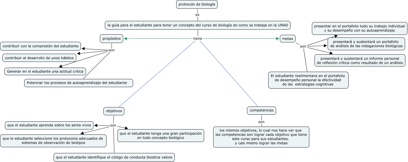 Este Cmap, tiene información relacionada con: biologia, competencias son los mismos objetivos, lo cual nos hace ver que las competencias son lograr cada objetivo que tiene este curso para sus estudiantes. y casi mismo lograr las metas, la guía para el estudiante para tener un concepto del curso de biología de como se trabaja en la UNAD tiene propósitos, propósitos son Potenciar los procesos de autoaprendizaje del estudiante, objetivos son que el estudiante tenga una gran participación en todo concepto biológico, propósitos son contribuir con la compresión del estudiante, propósitos son Generar en el estudiante una actitud critica, objetivos son que el estudiante aprenda sobre los seres vivos, objetivos tiene metas, protocolo de biología es la guía para el estudiante para tener un concepto del curso de biología de como se trabaja en la UNAD, la guía para el estudiante para tener un concepto del curso de biología de como se trabaja en la UNAD tiene metas, propósitos son contribuir al desarrollo de unos hábitos, metas son presentar en el portafolio todo su trabajo individual y su desempeño con su autoaprendizaje, metas son El estudiante realimentara en el portafolio de desempeño personal la efectividad de las estrategias cognitivas, objetivos son que el estudiante identifique el código de conducta bioetica valore, objetivos son que le estudiante seleccione los protocolos adecuados de sistemas de observación de biotipos, la guía para el estudiante para tener un concepto del curso de biología de como se trabaja en la UNAD tiene competencias, objetivos tiene propósitos, objetivos tiene competencias, metas son presentará y sustentará un informe personal de reflexión crítica como resultado de un análisis, metas son presentará y sustentará un portafolio de análisis de las indagaciones biológicas
