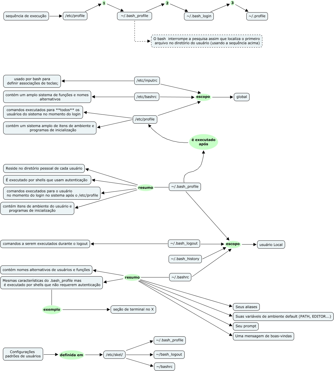 Esse mapa conceitual, produzido no IHMC CmapTools, tem a informação relacionada a: 01. Configuracoes do BASH, ~/.bash_login 3 ~/.profile, ~/.bash_profile resumo comandos executados para o usuário no momento do login no sistema após o /etc/profile, ~/.bash_profile escopo usuário Local, /etc/skel/ ~/bashrc, /etc/skel/ ~/bash_logout, ~/.bashrc resumo Uma mensagem de boas-vindas, ~/.bashrc resumo Mesmas características do .bash_profile mas é executado por shells que não requerem autenticação, ~/.bash_profile O bash interrompe a pesquisa assim que localiza o primeiro arquivo no diretório do usuário (usando a sequência acima), ~/.bash_profile resumo É executado por shells que usam autenticação, ~/.bash_logout comandos a serem executados durante o logout, /etc/profile comandos executados para **todos** os usuários do sistema no momento do login, ~/.bash_history escopo usuário Local, /etc/skel/ ~/.bash_profile, ~/.bash_profile resumo contém itens de ambiente do usuário e programas de inicialização, ~/.bash_profile é executado após /etc/profile, ~/.bashrc resumo Seus aliases, /etc/profile contém um sistema amplo de itens de ambiente e programas de inicialização, ~/.bash_profile 2 ~/.bash_login, sequência de execução /etc/profile, ~/.bash_logout escopo usuário Local