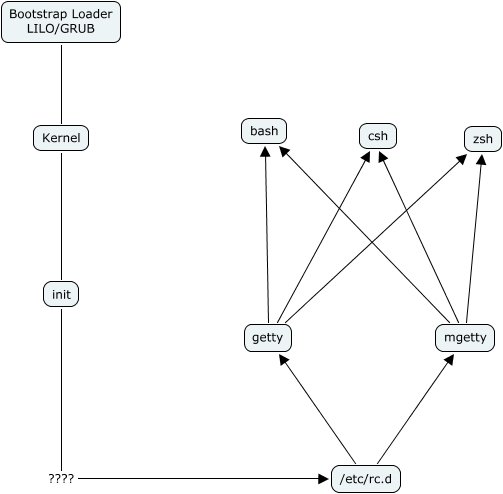 Esse mapa conceitual, produzido no IHMC CmapTools, tem a informação relacionada a: 02. Bootstrap, init ???? /etc/rc.d, /etc/rc.d mgetty, getty zsh, mgetty csh, /etc/rc.d getty, mgetty zsh, getty bash, Kernel init, Bootstrap Loader LILO/GRUB Kernel, mgetty bash, getty csh