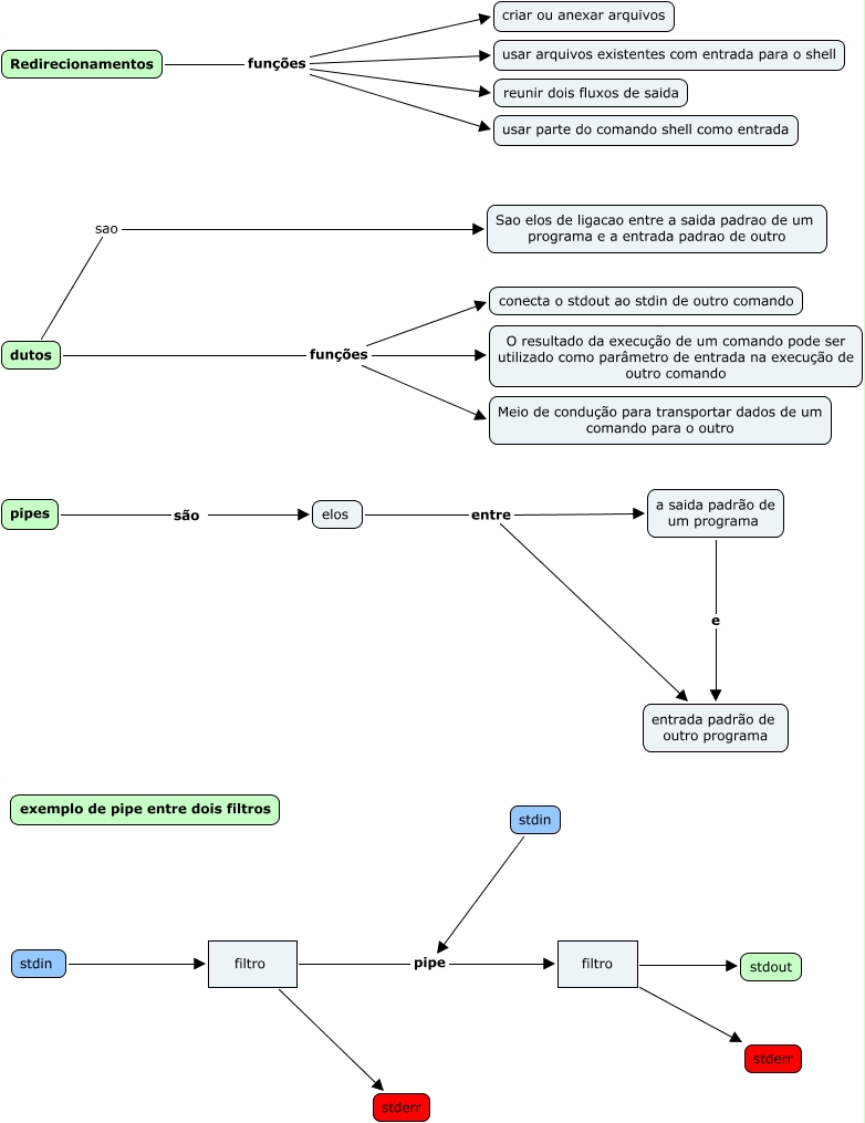 Esse mapa conceitual, produzido no IHMC CmapTools, tem a informação relacionada a: 06. Redirecionamentos e Dutos, filtro stderr, pipes são elos, dutos funções conecta o stdout ao stdin de outro comando, elos entre a saida padrão de um programa, elos entre entrada padrão de outro programa, dutos funções O resultado da execução de um comando pode ser utilizado como parâmetro de entrada na execução de outro comando, a saida padrão de um programa e entrada padrão de outro programa, Redirecionamentos funções criar ou anexar arquivos, Redirecionamentos funções reunir dois fluxos de saida, dutos funções Meio de condução para transportar dados de um comando para o outro, dutos sao Sao elos de ligacao entre a saida padrao de um programa e a entrada padrao de outro, stdin pipe filtro, stdin filtro, Redirecionamentos funções usar arquivos existentes com entrada para o shell, Redirecionamentos funções usar parte do comando shell como entrada, filtro stderr, filtro pipe filtro, filtro stdout