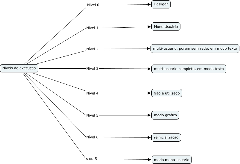 Esse mapa conceitual, produzido no IHMC CmapTools, tem a informação relacionada a: 04. Niveis de Execucao, Niveis de execuçao s ou S modo mono-usuário, Niveis de execuçao Nivel 0 Desligar, Niveis de execuçao Nível 6 reinicialização, Niveis de execuçao Nível 5 modo gráfico, Niveis de execuçao Nível 3 multi-usuário completo, em modo texto, Niveis de execuçao Nível 2 multi-usuário, porém sem rede, em modo texto, Niveis de execuçao Nível 4 Não é utilizado, Niveis de execuçao Nivel 1 Mono Usuário