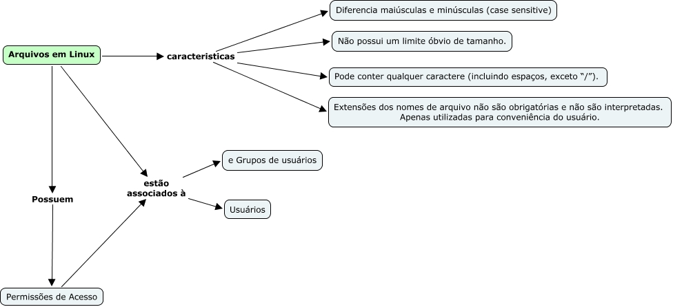 Esse mapa conceitual, produzido no IHMC CmapTools, tem a informação relacionada a: 02. Arquivos em Linux, Permissões de Acesso estão associados à e Grupos de usuários, Arquivos em Linux caracteristicas Diferencia maiúsculas e minúsculas (case sensitive), Permissões de Acesso estão associados à Usuários, Arquivos em Linux caracteristicas Pode conter qualquer caractere (incluindo espaços, exceto “/”)., Arquivos em Linux estão associados à Usuários, Arquivos em Linux estão associados à e Grupos de usuários, Arquivos em Linux caracteristicas Extensões dos nomes de arquivo não são obrigatórias e não são interpretadas. Apenas utilizadas para conveniência do usuário., Arquivos em Linux caracteristicas Não possui um limite óbvio de tamanho., Arquivos em Linux Possuem Permissões de Acesso