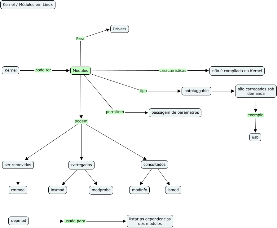 Esse mapa conceitual, produzido no IHMC CmapTools, tem a informação relacionada a: 01. Modulos, Modulos tipo hotpluggable, consultados modinfo, são carregados sob demanda exemplo usb, Modulos podem carregados, consultados lsmod, hotpluggable são carregados sob demanda, Modulos podem consultados, Modulos Para Drivers, carregados modprobe, Modulos caracteristicas não é compilado no Kernel, Modulos permitem passagem de parametros, depmod usado para listar as dependencias dos módulos, ser removidos rmmod, Kernel pode ter Modulos, Modulos podem ser removidos, carregados insmod