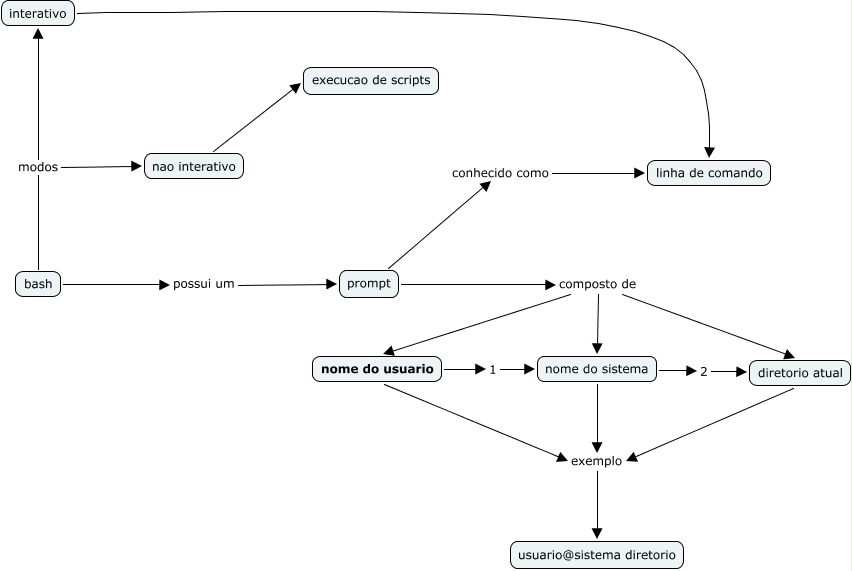 Esse mapa conceitual, produzido no IHMC CmapTools, tem a informação relacionada a: 01. bash, prompt composto de nome do usuario, prompt conhecido como linha de comando, interativo linha de comando, bash modos interativo, nao interativo execucao de scripts, prompt composto de diretorio atual, nome do sistema exemplo usuario@sistema diretorio, nome do sistema 2 diretorio atual, diretorio atual exemplo usuario@sistema diretorio, prompt composto de nome do sistema, bash modos nao interativo, nome do usuario exemplo usuario@sistema diretorio, nome do usuario 1 nome do sistema, bash possui um prompt