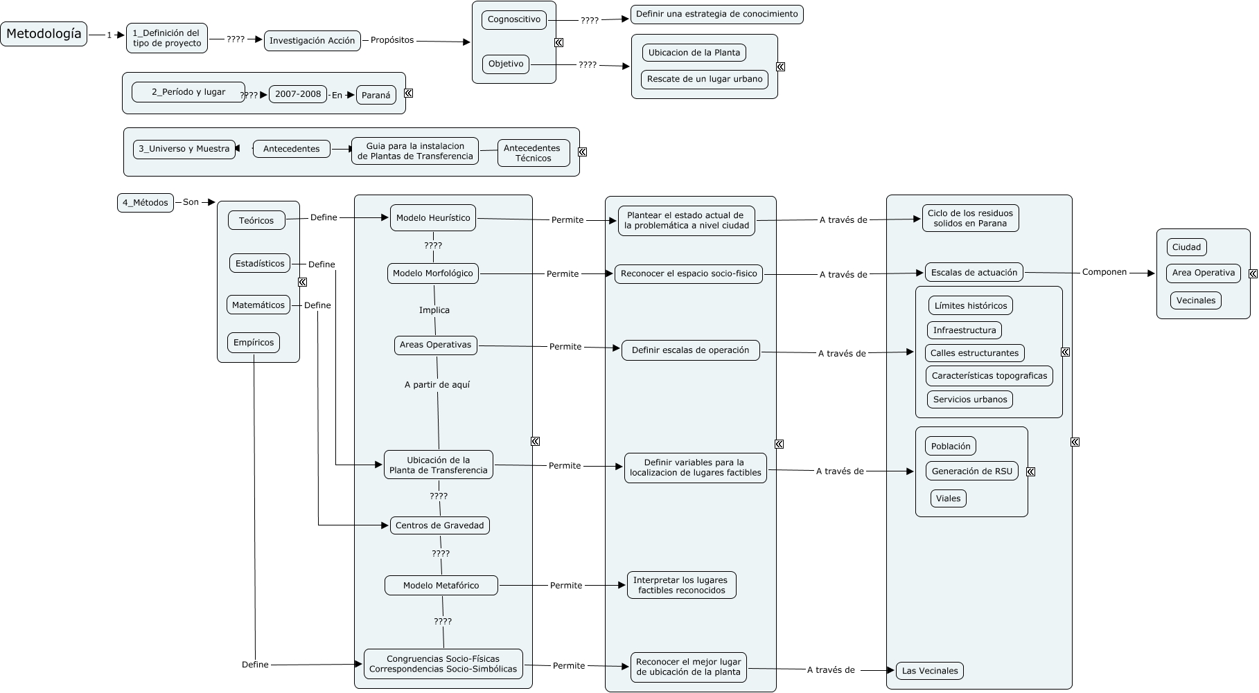 Este Cmap, tiene información relacionada con: 05_Metodología, Modelo Metafórico ???? Congruencias Socio-Físicas Correspondencias Socio-Simbólicas, 2007-2008 En Paraná, Reconocer el mejor lugar de ubicación de la planta A través de Las Vecinales, Metodología 1 1_Definición del tipo de proyecto, Estadísticos Define Ubicación de la Planta de Transferencia, Ubicación de la Planta de Transferencia ???? Centros de Gravedad, Modelo Heurístico Permite Plantear el estado actual de la problemática a nivel ciudad, Plantear el estado actual de la problemática a nivel ciudad A través de Ciclo de los residuos solidos en Parana, Definir variables para la localizacion de lugares factibles A través de ????, 3_Universo y Muestra ???? Antecedentes, Escalas de actuación Componen ????, Modelo Metafórico Permite Interpretar los lugares factibles reconocidos, Definir escalas de operación A través de ????, Empíricos Define Congruencias Socio-Físicas Correspondencias Socio-Simbólicas, Ubicación de la Planta de Transferencia Permite Definir variables para la localizacion de lugares factibles, 1_Definición del tipo de proyecto ???? Investigación Acción, Antecedentes ???? Guia para la instalacion de Plantas de Transferencia, Objetivo ???? ????, 4_Métodos Son ????, Cognoscitivo ???? Definir una estrategia de conocimiento