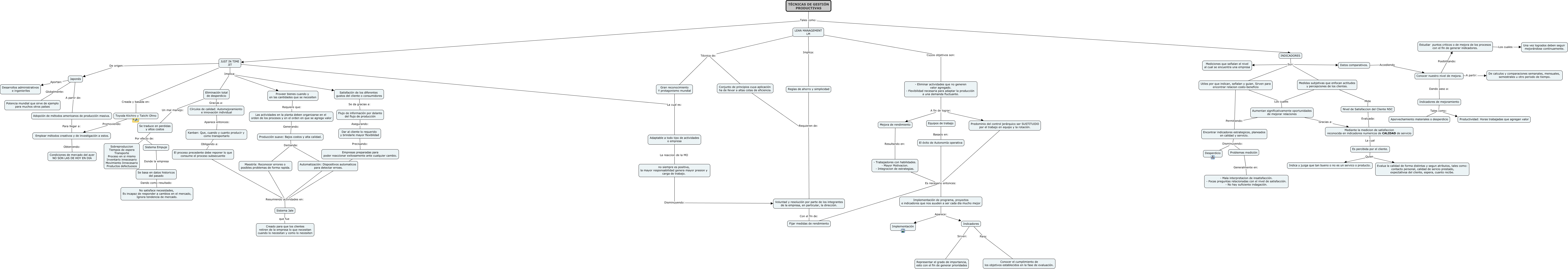 Este Cmap, tiene información relacionada con: TECNICAS DE GESTION PRODUCTIVAS, Japonés A partir de: Adopción de métodos americanos de producción masiva., Indicadores Sirven: Representar el grado de importancia, esto con el fin de generar prioridades, Gran reconocimiento Y protagonismo mundial La cual es: Adaptable a todo tipo de actividades o empresa, Es percibida por el cliente. Quien Indica y juzga que tan bueno o no es un servico o producto., Las actividades en la planta deben organizarse en el orden de los procesos y en el orden en que se agrega valor Generando: Producción suave: Bajos costos y alta calidad., - Eliminar actividades que no generen valor agregado. - Flexibilidad necesaria para adaptar la producción a una demanda fluctuante. A fin de lograr: Mejora de rendimiento, TÉCNICAS DE GESTIÓN PRODUCTIVAS Tales como: JUST IN TIME JIT, Se basa en datos historicos del pasado Dando como resultado: No satisface necesidades, Es incapaz de responder a cambios en el mercado, Ignora tendencia de mercado., Adopción de métodos americanos de producción masiva. Para llegar a: Emplear métodos creativos y de investigación a estos., LEAN MANAGEMENT LM Técnica de: Gran reconocimiento Y protagonismo mundial, Encontrar indicadores estrategicos, planeados en calidad y servicio. Disminuyendo: Desperdicio, TÉCNICAS DE GESTIÓN PRODUCTIVAS Tales como: INDICADORES, LEAN MANAGEMENT LM Técnica de: Conjunto de principios cuya aplicación ha de llevar a altas cotas de eficiencia., Se traduce en perdidas y altos costos Por efecto de: Sistema Empuje, JUST IN TIME JIT Implica: Eliminación total de desperdicio, no siempre es positiva, la mayor responsabilidad genera mayor presion y carga de trabajo. Disminuyendo: Voluntad y resolución por parte de los integrantes de la empresa, en particular, la dirección., Indicadores de mejoramiento Tales como: Aporvechamiento materiales o desperdicio, Implementación de programa, proyectos e indicadores que nos ayuden a ser cada día mucho mejor Aparece: Implementación, Encontrar indicadores estrategicos, planeados en calidad y servicio. Disminuyendo: Problemas medición, Reglas de ahorro y simplicidad Requieren de: Voluntad y resolución por parte de los integrantes de la empresa, en particular, la dirección.