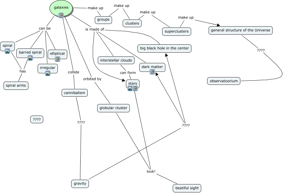 This Concept Map, created with IHMC CmapTools, has information related to: Galaktikad, galaxies can be spiral, galaxies collide cannibalism, galaxies can be irregular, observatoorium ???? general structure of the Universe, galaxies can be barred spiral, galaxies is made of dark matter, galaxies orbited by globular cluster, gravity ???? dark matter, globular cluster look! beatiful sight, gravity ???? cannibalism, spiral has spiral arms, clusters make up superclusters, gravity ???? big black hole in the center, groups make up clusters, interstellar clouds can form stars, barred spiral has spiral arms, galaxies is made of big black hole in the center, galaxies is made of stars, stars look! beatiful sight, galaxies make up groups