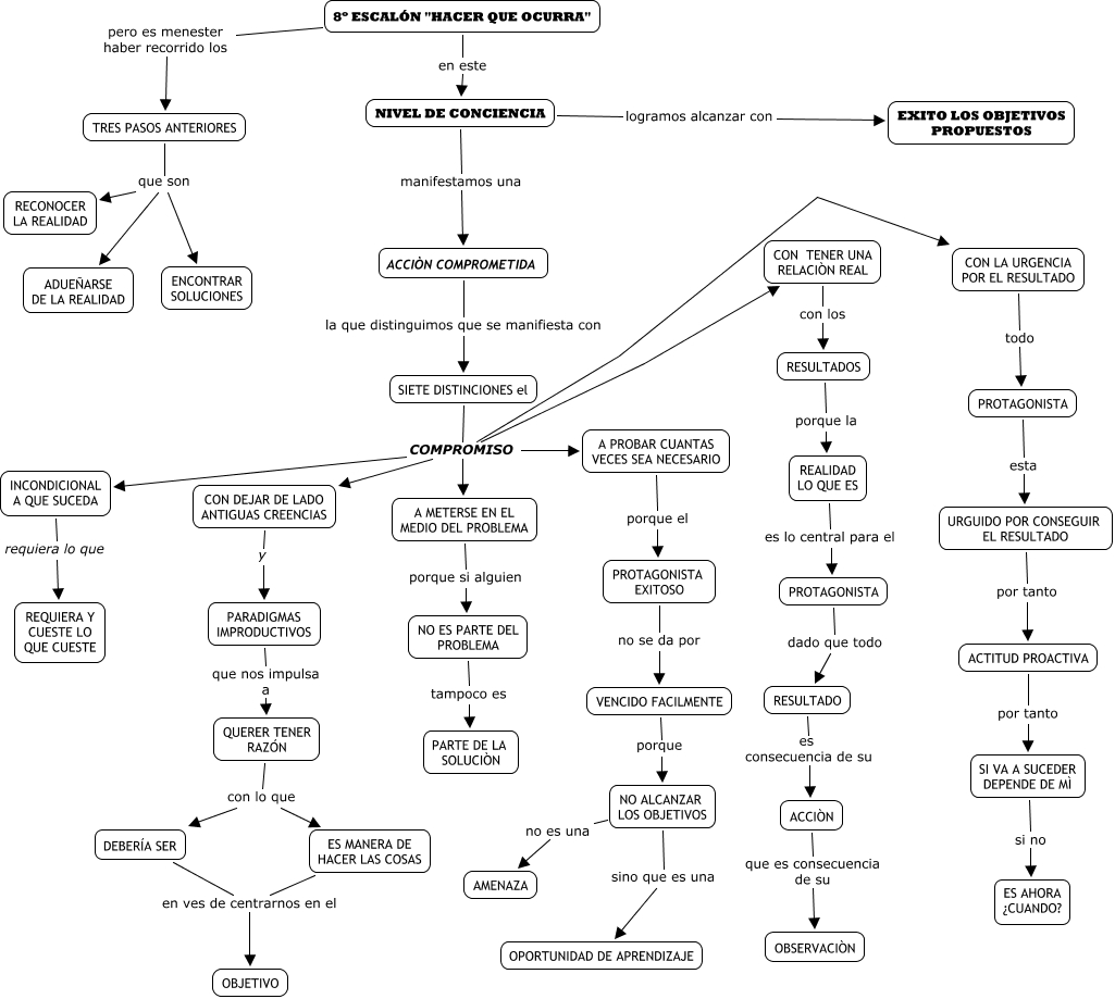 Este Cmap, tiene información relacionada con: 8º ESCALÓN LA ACCIÒN COMPROMETIDA, CON TENER UNA RELACIÒN REAL con los RESULTADOS, QUERER TENER RAZÓN con lo que DEBERÍA SER, ES MANERA DE HACER LAS COSAS en ves de centrarnos en el OBJETIVO, ACTITUD PROACTIVA por tanto SI VA A SUCEDER DEPENDE DE MÌ, NO ES PARTE DEL PROBLEMA tampoco es PARTE DE LA SOLUCIÒN, NO ALCANZAR LOS OBJETIVOS sino que es una OPORTUNIDAD DE APRENDIZAJE, NIVEL DE CONCIENCIA manifestamos una ACCIÒN COMPROMETIDA, NO ALCANZAR LOS OBJETIVOS no es una AMENAZA, 8º ESCALÓN "HACER QUE OCURRA" pero es menester haber recorrido los TRES PASOS ANTERIORES, SIETE DISTINCIONES el COMPROMISO INCONDICIONAL A QUE SUCEDA, A PROBAR CUANTAS VECES SEA NECESARIO porque el PROTAGONISTA EXITOSO, RESULTADOS porque la REALIDAD LO QUE ES, QUERER TENER RAZÓN con lo que ES MANERA DE HACER LAS COSAS, PARADIGMAS IMPRODUCTIVOS que nos impulsa a QUERER TENER RAZÓN, ACCIÒN que es consecuencia de su OBSERVACIÒN, TRES PASOS ANTERIORES que son RECONOCER LA REALIDAD, DEBERÍA SER en ves de centrarnos en el OBJETIVO, SIETE DISTINCIONES el COMPROMISO CON LA URGENCIA POR EL RESULTADO, ACCIÒN COMPROMETIDA la que distinguimos que se manifiesta con SIETE DISTINCIONES el, SIETE DISTINCIONES el COMPROMISO A PROBAR CUANTAS VECES SEA NECESARIO