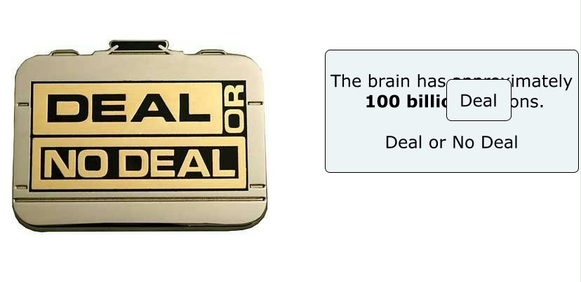 This Concept Map, created with IHMC CmapTools, has information related to: Q 1 BD, Deal The brain has approximately 100 billion neurons. Deal or No Deal