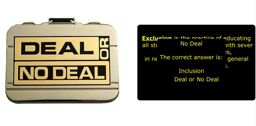 This Concept Map, created with IHMC CmapTools, has information related to: Q 2 PN, No Deal The correct answer is: Inclusion Exclusion is the practice of educating all students, including those with sever and multiple disabilities, in neighborhood schools and general education classrooms. Deal or No Deal