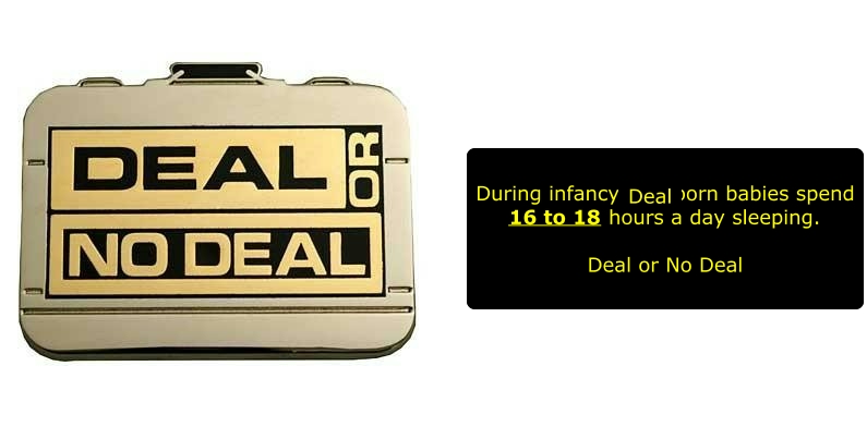 This Concept Map, created with IHMC CmapTools, has information related to: Q 2 WB, Deal During infancy, newborn babies spend 16 to 18 hours a day sleeping. Deal or No Deal