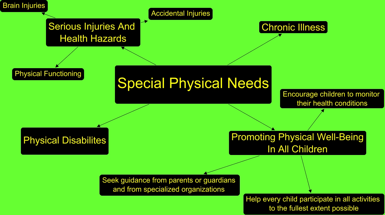 This Concept Map, created with IHMC CmapTools, has information related to: Special Physical Needs, Serious Injuries And Health Hazards Physical Functioning, Promoting Physical Well-Being In All Children Seek guidance from parents or guardians and from specialized organizations, Serious Injuries And Health Hazards Brain Injuries, Serious Injuries And Health Hazards Accidental Injuries, Special Physical Needs Serious Injuries And Health Hazards, Special Physical Needs Physical Disabilites, Promoting Physical Well-Being In All Children Help every child participate in all activities to the fullest extent possible, Special Physical Needs Promoting Physical Well-Being In All Children, Promoting Physical Well-Being In All Children Encourage children to monitor their health conditions, Special Physical Needs Chronic Illness