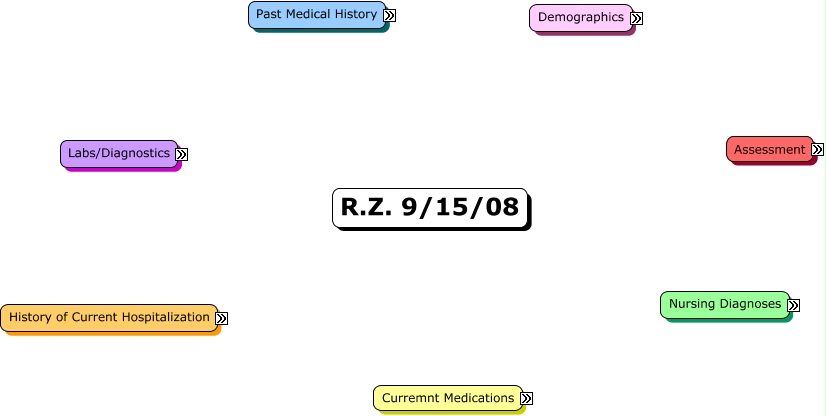This Concept Map, created with IHMC CmapTools, has information related to: 9-15 CMAP Caddle, Impaired gas exchange related to edema formation. Intervention Monitor for carbon dioxide narcosis which may occur in clients recieving long-term oxygen therapy, Respiratory 15:30 Tachypneic, equal chest expansion bilaterally. Rhonchi on expiration bilaterally throughout. Rales on inspiration bilaterally throughout. Chest symmetrical bilaterally. SpO2 95% No retractions noted. Trach sutured in place, size 8 Shiley. Vent Settings: AC Rate:20 Vol:450 FI02:50% PEEP:7 Peak flow:70, Ineffective airway clearance related to loss of ciliary action as evidenced by rales and ronchi upon auscultation. Intervention Auscultate breath sounds and assess air movement to ascertain status and note progress., Gen. Chem. Trends and Interpretation Potassium is being replaced in Prisma. Alk phos is elevated, indicating some biiary tree involvement in her systems failure. ALT and AST are grossly elevated, hepatic failure. BUN and Cr elevated, renal failure. However, they are trending down since the patient started Prisma., Gen. Chem. 9/14 Na=139 K=4.8 Cl=102 CO2=27 BUN=47 Cr=1.44 Glu=119 Ca=10 Total Bili=34.1 Alk Phos=156 AST=157 ALT=64, CBC 9/14 WBC=27.7 RBC=3.62 Hgb=10.8 Hct=33.7 Plt=92, Simvastatin Brand Name Zocor, Gen. Chem. 9/15 Na=137 K=4.8 Cl=103 CO2=29 BUN=46 Cr=1.42 Glu=86 Ca=10.2 Protein=5.0 Albumin=3.4 Total Bili=41.6 Alk Phos=233 AST=270 ALT=83, Insulin Drip Hourly Record 18:00 blood glucose=116 Infusion rate=3.5 units/hr No change, Simvastatin Reason for Recieving High cholesterol, CBC Trends and Interpretation White counts elevated d/t infection of unknown location. Decreasing independently, no antibiotics given. RBC and platelets decreased with kidney and liver insufficiency., Insulin Regular Human Nursing Indications Monitor for s/s Hypoglycemia, Ineffective airway clearance related to loss of ciliary action as evidenced by rales and ronchi upon auscultation. Intervention Assist with respiratory treatments., Insulin Regular Human Pertinent Lab Values See hourly insulin drip table in lab section, Insulin Regular Human Reason for Recieving Elevated blood sugar, D.M., Cardiovascular 15:30 HR 88BPM. No JVD. No carotid bruit. S1 and S2 sounds heard. Bilateral radial pulses present, +2. L pedal pulse present, +2. R pedal pulse present, +1. Capillary refill 3 seconds. +3 pitting edema lower extremities. +1 pitting edema upper extremeties. LE very cool to the touch. Current rhythm: NSR, Insulin Regular Human Classification Antidiabetic, pancreatic hormone. Exogenous unmodified insulin, Gen. Chem. 9/13 Na=138 K=3.5 Cl=101 CO2=29 BUN=50 Cr=1.66 Glu=93 Ca=9.5, Simvastatin Classification Antilipidemic, HMG-CoA reductase inhibitor, Decreased cardiac output related to reduction in stroke volume as a result of mechanical/structural problems Intervention Monitor cardiac rhythm continuously to note effectiveness of medications.