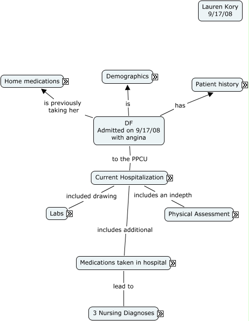 This Concept Map has information related to: CMAP9-17-08, Medications taken in hospital lead to 3 Nursing Diagnoses, Current Hospitalization includes an indepth Physical Assessment, DF Admitted on 9/17/08 with angina is Demographics, DF Admitted on 9/17/08 with angina is previously taking her Home medications, DF Admitted on 9/17/08 with angina has Patient history, DF Admitted on 9/17/08 with angina to the PPCU Current Hospitalization, Current Hospitalization included drawing Labs, Current Hospitalization includes additional Medications taken in hospital