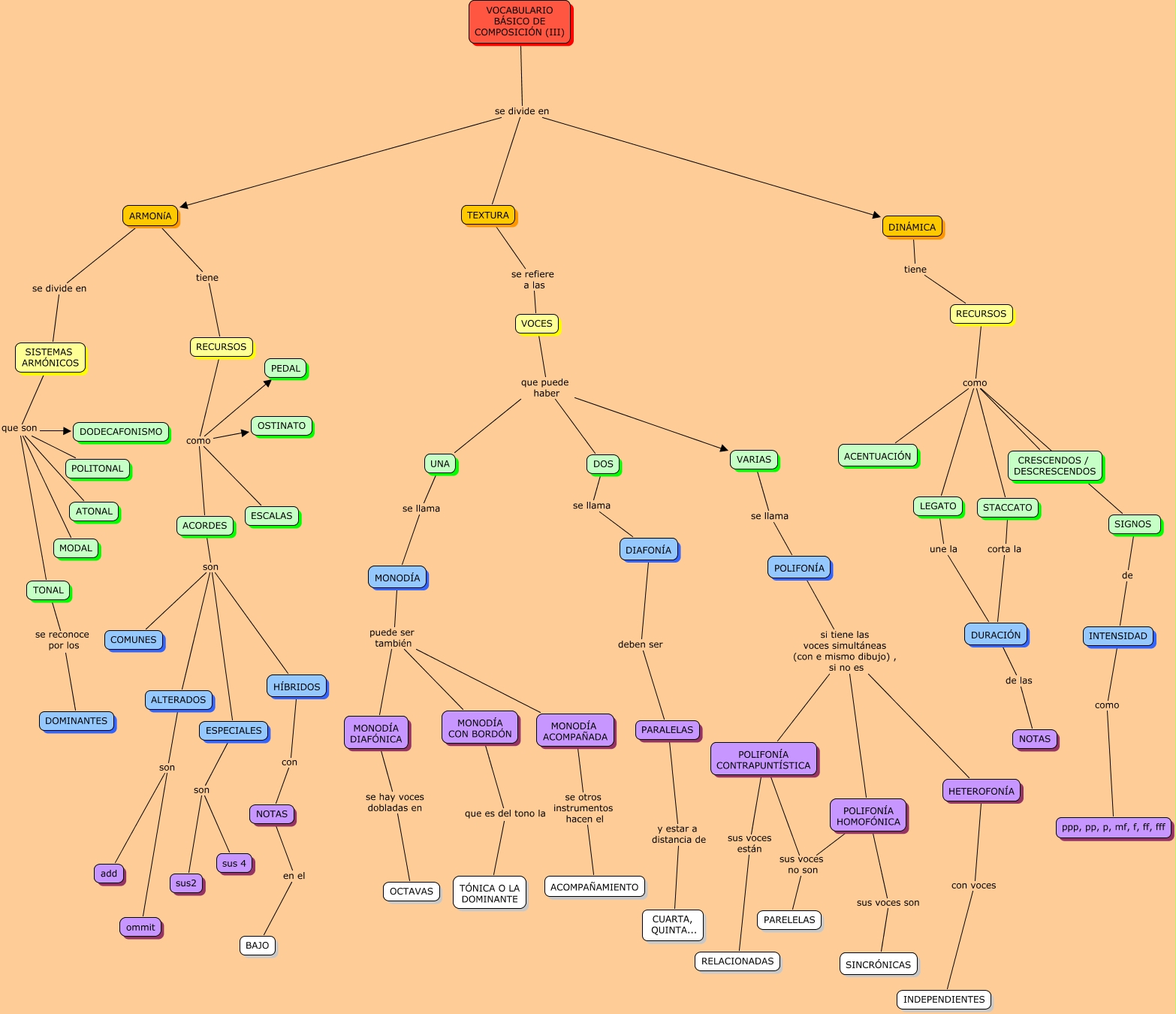 Este Cmap, tiene información relacionada con: Vocabulario Básico de composición de canciones III, NOTAS en el BAJO, SIGNOS de INTENSIDAD, MONODÍA puede ser también MONODÍA DIAFÓNICA, VARIAS se llama POLIFONÍA, INTENSIDAD como ppp, pp, p, mf, f, ff, fff, VOCES que puede haber VARIAS, DURACIÓN de las NOTAS, RECURSOS como CRESCENDOS / DESCRESCENDOS, STACCATO corta la DURACIÓN, MONODÍA ACOMPAÑADA se otros instrumentos hacen el ACOMPAÑAMIENTO, ALTERADOS son ommit, POLIFONÍA HOMOFÓNICA sus voces son SINCRÓNICAS, PARALELAS y estar a distancia de CUARTA, QUINTA..., ACORDES son ALTERADOS, VOCES que puede haber DOS, SISTEMAS ARMÓNICOS que son ATONAL, DOS se llama DIAFONÍA, RECURSOS como SIGNOS, MONODÍA CON BORDÓN que es del tono la TÓNICA O LA DOMINANTE, POLIFONÍA si tiene las voces simultáneas (con e mismo dibujo) , si no es HETEROFONÍA