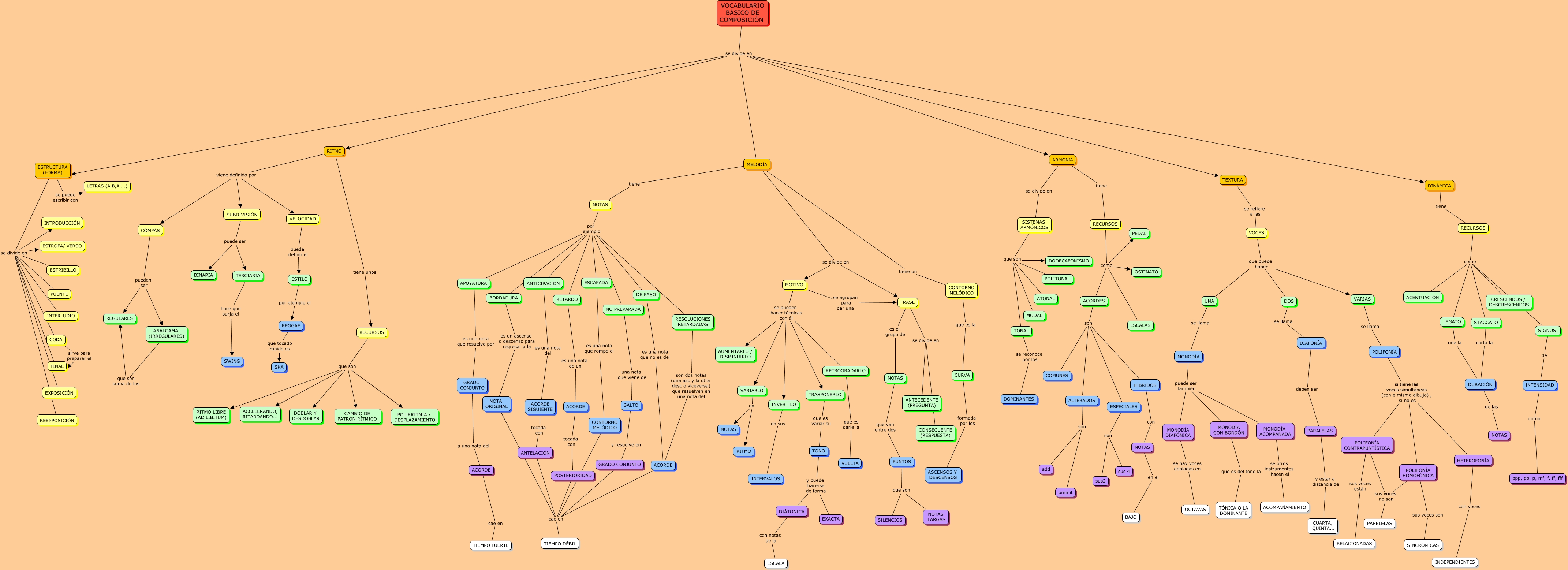 Este Cmap, tiene información relacionada con: Vocabulario Básico de composición de canciones (TODO), MONODÍA puede ser también MONODÍA DIAFÓNICA, ESTRUCTURA (FORMA) se divide en REEXPOSICIÓN, ACORDES son ALTERADOS, APOYATURA es una nota que resuelve por GRADO CONJUNTO, RECURSOS que son POLIRRÍTMIA / DESPLAZAMIENTO, ARMONíA se divide en SISTEMAS ARMÓNICOS, RECURSOS que son RITMO LIBRE (AD LIBITUM), NOTAS por ejemplo ANTICIPACIÓN, SISTEMAS ARMÓNICOS que son POLITONAL, ESTRUCTURA (FORMA) se divide en ESTRIBILLO, VOCES que puede haber UNA, SIGNOS de INTENSIDAD, ARMONíA tiene RECURSOS, TONO y puede hacerse de forma EXACTA, ACORDE tocada con POSTERIORIDAD, SUBDIVISIÓN puede ser TERCIARIA, RECURSOS que son ACCELERANDO, RITARDANDO..., VOCES que puede haber VARIAS, MONODÍA CON BORDÓN que es del tono la TÓNICA O LA DOMINANTE, VOCES que puede haber DOS