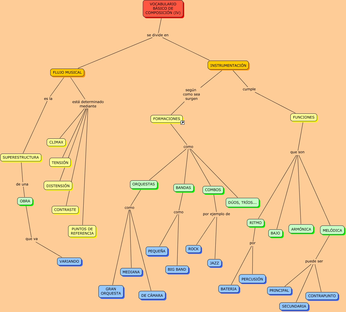 Este Cmap, tiene información relacionada con: Vocabulario Básico de composición de canciones IV, BANDAS como PEQUEÑA, ORQUESTAS como DE CÁMARA, ORQUESTAS como MEDIANA, OBRA que va VARIANDO, RITMO por BATERIA, FORMACIONES como ORQUESTAS, FLUJO MUSICAL es la SUPERESTRUCTURA, FLUJO MUSICAL está determinado mediante CONTRASTE, FLUJO MUSICAL está determinado mediante CLIMAX, FUNCIONES que son RITMO, MELÓDICA puede ser PRINCIPAL, FLUJO MUSICAL está determinado mediante PUNTOS DE REFERENCIA, SUPERESTRUCTURA de una OBRA, VOCABULARIO BÁSICO DE COMPOSICIÓN (IV) se divide en INSTRUMENTACIÓN, INSTRUMENTACIÓN cumple FUNCIONES, BANDAS como BIG BAND, VOCABULARIO BÁSICO DE COMPOSICIÓN (IV) se divide en FLUJO MUSICAL, FORMACIONES como COMBOS, ORQUESTAS como GRAN ORQUESTA, FLUJO MUSICAL está determinado mediante TENSIÓN