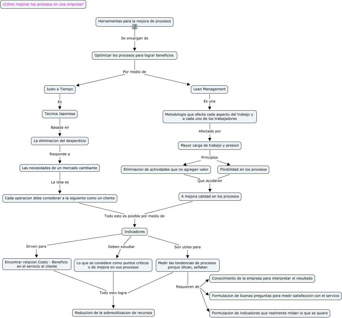 Este Cmap, tiene información relacionada con: Herramientas para la mejora de procesos - TatiGaviria, Mayor carga de trabajo y presion Principios Flixibilidad en los procesos, Indicadores Sirven para Encontrar relacion Costo - Beneficio en el servicio al cliente, Indicadores Son utiles para Medir las tendencias de procesos porque idican, señalan, Cada operacion debe considerar a la siguiente como un cliente Todo esto es posible por medio de Indicadores, Las necesidades de un mercado cambiante La idea es Cada operacion debe considerar a la siguiente como un cliente, Optimizar los procesos para lograr beneficios Por medio de Justo a Tiempo, Medir las tendencias de procesos porque idican, señalan Requieren de Formulacion de indicadores que realmente midan lo que se quiere, Mayor carga de trabajo y presion Principios Eliminacion de actividades que no agregan valor, Flixibilidad en los procesos Que ayudaran A mejora calidad en los procesos, Herramientas para la mejora de procesos Se encargan de Optimizar los procesos para lograr beneficios, Optimizar los procesos para lograr beneficios Por medio de Lean Management, La eliminacion del desperdicio Responde a Las necesidades de un mercado cambiante, A mejora calidad en los procesos Todo esto es posible por medio de Indicadores, Indicadores Deben estudiar Lo que se considere como puntos criticos o de mejora en sus procesos, Lo que se considere como puntos criticos o de mejora en sus procesos Todo esto logra Reduccion de la sobreutilizacion de recursos, Encontrar relacion Costo - Beneficio en el servicio al cliente Todo esto logra Reduccion de la sobreutilizacion de recursos, Medir las tendencias de procesos porque idican, señalan Todo esto logra Reduccion de la sobreutilizacion de recursos, Lean Management Es una Metodologia que afecta cada aspecto del trabajo y a cada uno de los trabajadores, Metodologia que afecta cada aspecto del trabajo y a cada uno de los trabajadores Afectada por Mayor carga de trabajo y presion, Eliminacion de actividades que no agregan valor Que ayudaran A mejora calidad en los procesos
