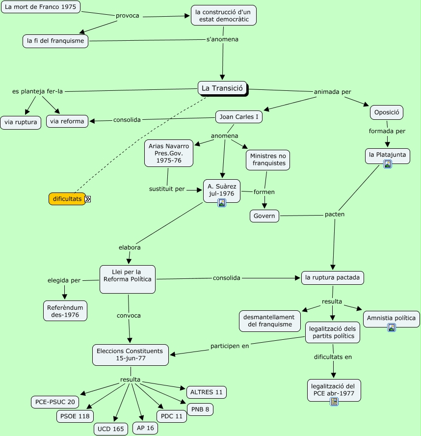 Este Cmap, tiene información relacionada con: latransicio, la ruptura pactada resulta desmantellament del franquisme, La Transició animada per Oposició, Llei per la Reforma Política consolida la ruptura pactada, problemes com protestes carrer, la Platajunta pacten la ruptura pactada, legalització dels partits polítics participen en Eleccions Constituents 15-jun-77, problemes com repressió, Llei per la Reforma Política elegida per Referèndum des-1976, Joan Carles I anomena Arias Navarro Pres.Gov. 1975-76, La Transició pateix problemes, Eleccions Constituents 15-jun-77 resulta ALTRES 11, Eleccions Constituents 15-jun-77 resulta PNB 8, A. Suàrez jul-1976 formen Govern, Eleccions Constituents 15-jun-77 resulta AP 16, La Transició es planteja fer-la via reforma, legalització dels partits polítics dificultats en legalització del PCE abr-1977, Arias Navarro Pres.Gov. 1975-76 sustituit per A. Suàrez jul-1976, la ruptura pactada resulta legalització dels partits polítics, la construcció d'un estat democràtic s'anomena La Transició, Joan Carles I anomena Ministres no franquistes