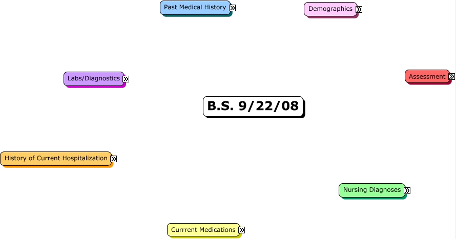 This Concept Map, created with IHMC CmapTools, has information related to: 9-22 CMAP, Cardiovascular 15:30 HR 87BPM. No JVD. No carotid bruit. S1 and S2 sounds heard. Bilateral radial pulses present, +2. Bilateral pedal pulses present, +2. Capillary refill less than 3 seconds.+1 nonpitting edema lower extremities. Lower extremeties cool to touch. Current rhythm: NSR, Gen. Chem. 9/21 Na=140 K=3.5 Cl=110 CO2=29 BUN=17 Cr=.98 Glu=127 Ca=7.3, Insulin aspart Brand Name Novolog, Ketoralac Brand Name Toradol, Ketoralac Classification NSAID, Nonopiod analgesic, Acetic acid, Furosemide Brand Name Lasix, Esomeprazole Classification Antiulcer, Proton pump inhibitor, Benzimidazole, Insulin aspart Nursing Indications Monitor for s/s Hypoglycemia, Acute pain related to surgical intervention as evidenced by wincing, guarding, and verbalized reports. Intervention Determine client's acceptable level of pain on the 0-10 scale., Integumentary 15:30 Triple lumen PICC in right jugular vein, all lines patent to flush. Braden score=14. No redness or swelling at site. Skin is appropriately pink. Lower extremeties cool to touch. Skin is mobile, adequate turgor. +1 non pitting edema in both lower extremeties. Incision site is well approximated, tender to touch, with staples intact. Dressing is clean dry and intact,, Simvastatin Brand Name Fentanyl, Ketoralac Nursing Indications Push time: over 15 sec, Assess pain and swelling, monitor renal studies., Gen. Chem. Trends and Interpretation Glucose levels have been high, client is diabetic and manged with insulin. Calcium is low but trending back up, almost to normal range. Potassium is within range but on the low end, patient's fluids have added potassium and she has received a 60mEq bolus to help increase her K., Esomeprazole Physician's Order 20mg IV injection BID, Simvastatin Reason for Recieving Patient controlled analgesia, Ketoralac Physician's Order 15mg IV push Q6hr, Furosemide Nursing Indications Potassium wasting, Assess hydration & electrolytes. Administer in morning to avoid disrupting sleep., Simvastatin Nursing Indications Monitor neurologic & respiratory status, encouragae cough and deep breathe., Ineffective breathing pattern related to decreased lung expansion as evidenced by inability to produce adequate incentive spirometry measurements. Intervention Continue to encourage use of adjuncts such as the incentive spirometer to facilitate deeper respiratory effort., Gen. Chem. 9/22 Na=139 K=3.3 Cl=107 CO2=30 BUN=14 Cr=.83 Glu=124 Ca=7.8