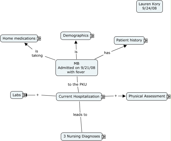 This Concept Map has information related to: CMAP9-24-08, Current Hospitalization + Labs, MB Admitted on 9/21/08 with fever to the PKU Current Hospitalization, MB Admitted on 9/21/08 with fever is Demographics, MB Admitted on 9/21/08 with fever has Patient history, Current Hospitalization leads to 3 Nursing Diagnoses, Current Hospitalization + Physical Assessment, MB Admitted on 9/21/08 with fever is taking Home medications