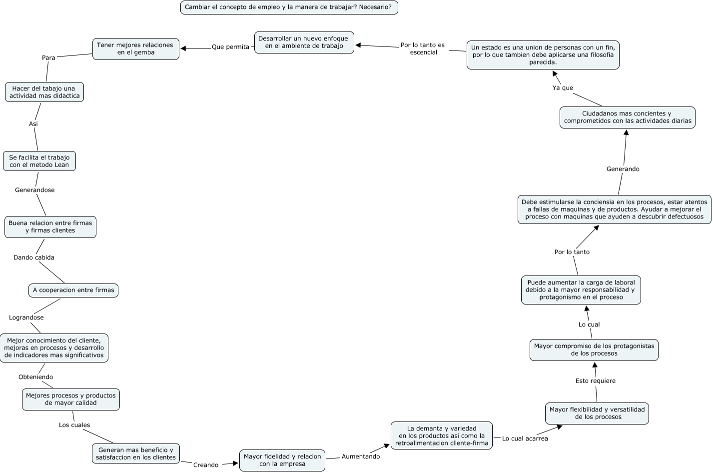 Este Cmap, tiene información relacionada con: Lean, indicadores, JIT, Mayor compromiso de los protagonistas de los procesos Lo cual Puede aumentar la carga de laboral debido a la mayor responsabilidad y protagonismo en el proceso, Ciudadanos mas concientes y comprometidos con las actividades diarias Ya que Un estado es una union de personas con un fin, por lo que tambien debe aplicarse una filosofia parecida., Mayor fidelidad y relacion con la empresa Aumentando La demanta y variedad en los productos asi como la retroalimentacion cliente-firma, Buena relacion entre firmas y firmas clientes Dando cabida A cooperacion entre firmas, Mejor conocimiento del cliente, mejoras en procesos y desarrollo de indicadores mas significativos Obteniendo Mejores procesos y productos de mayor calidad, Puede aumentar la carga de laboral debido a la mayor responsabilidad y protagonismo en el proceso Por lo tanto Debe estimularse la conciensia en los procesos, estar atentos a fallas de maquinas y de productos. Ayudar a mejorar el proceso con maquinas que ayuden a descubrir defectuosos, A cooperacion entre firmas Lograndose Mejor conocimiento del cliente, mejoras en procesos y desarrollo de indicadores mas significativos, La demanta y variedad en los productos asi como la retroalimentacion cliente-firma Lo cual acarrea Mayor flexibilidad y versatilidad de los procesos, Mayor flexibilidad y versatilidad de los procesos Esto requiere Mayor compromiso de los protagonistas de los procesos, Se facilita el trabajo con el metodo Lean Generandose Buena relacion entre firmas y firmas clientes, Debe estimularse la conciensia en los procesos, estar atentos a fallas de maquinas y de productos. Ayudar a mejorar el proceso con maquinas que ayuden a descubrir defectuosos Generando Ciudadanos mas concientes y comprometidos con las actividades diarias, Desarrollar un nuevo enfoque en el ambiente de trabajo Que permita Tener mejores relaciones en el gemba, Un estado es una union de personas con un fin, por lo que tambien debe aplicarse una filosofia parecida. Por lo tanto es escencial Desarrollar un nuevo enfoque en el ambiente de trabajo, Hacer del tabajo una actividad mas didactica Asi Se facilita el trabajo con el metodo Lean, Generan mas beneficio y satisfaccion en los clientes Creando Mayor fidelidad y relacion con la empresa, Tener mejores relaciones en el gemba Para Hacer del tabajo una actividad mas didactica, Mejores procesos y productos de mayor calidad Los cuales Generan mas beneficio y satisfaccion en los clientes