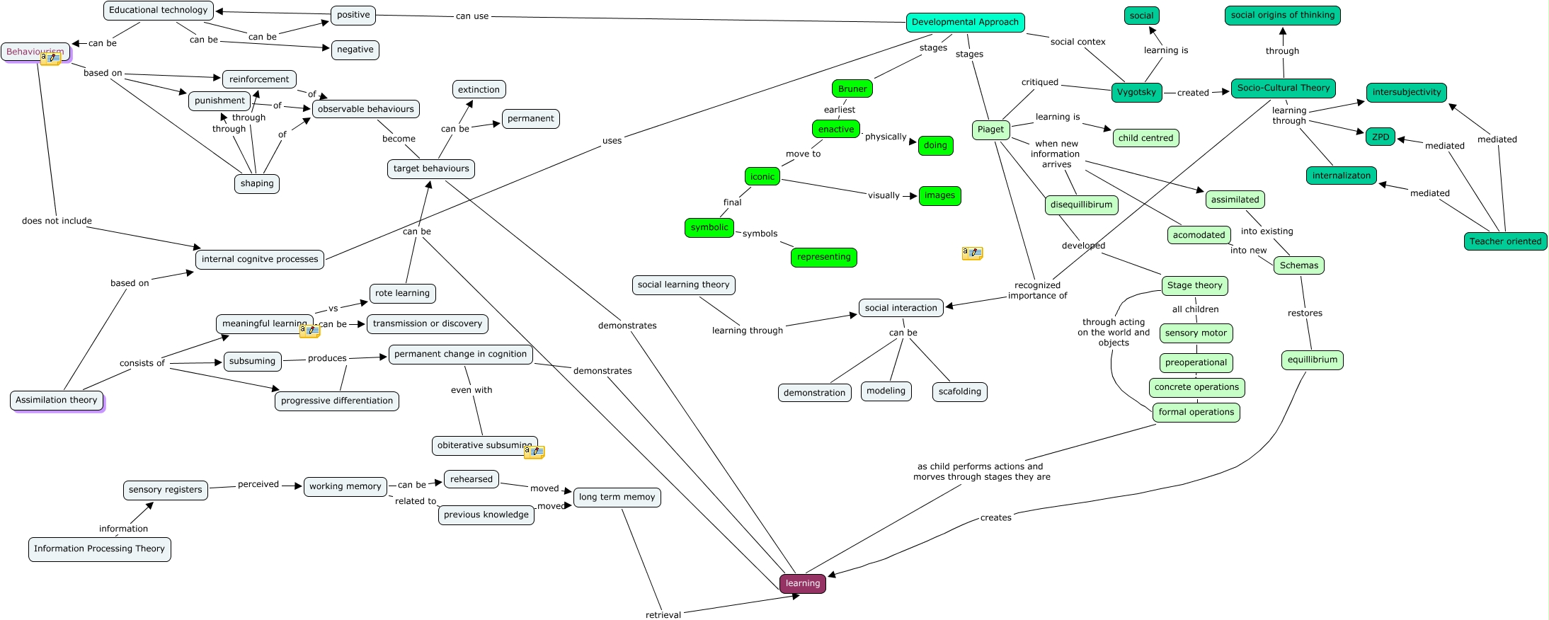 This Concept Map, created with IHMC CmapTools, has information related to: ET Theory, meaningful learning vs rote learning, preoperational concrete operations, equillibrium creates learning, Vygotsky created Socio-Cultural Theory, Teacher oriented mediated ZPD, Socio-Cultural Theory through social origins of thinking, long term memoy retrieval learning, Information Processing Theory information sensory registers, Behaviourism based on reinforcement, reinforcement of observable behaviours, enactive physically doing, working memory can be rehearsed, Educational technology can be negative, Developmental Approach social contex Vygotsky, symbolic symbols representing, permanent change in cognition demonstrates learning, punishment of observable behaviours, target behaviours can be permanent, Piaget learning is child centred, iconic visually images