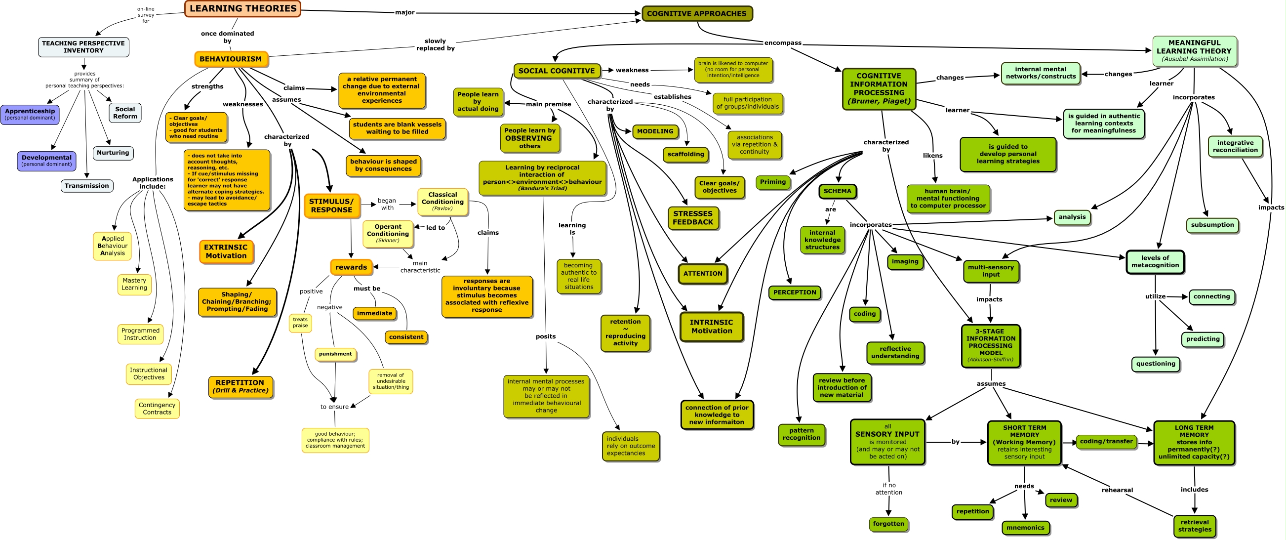 This Concept Map, created with IHMC CmapTools, has information related to: vicky earle map 1, SHORT TERM MEMORY (Working Memory) retains interesting sensory input needs mnemonics, SCHEMA incorporates multi-sensory input, BEHAVIOURISM characterized by Shaping/ Chaining/Branching; Prompting/Fading, COGNITIVE INFORMATION PROCESSING (Bruner, Piaget) characterized by SCHEMA, BEHAVIOURISM characterized by STIMULUS/ RESPONSE, MEANINGFUL LEARNING THEORY (Ausubel Assimilation) incorporates levels of metacognition, COGNITIVE INFORMATION PROCESSING (Bruner, Piaget) changes internal mental networks/constructs, SOCIAL COGNITIVE establishes associations via repetition & continuity, SOCIAL COGNITIVE characterized by INTRINSIC Motivation, 3-STAGE INFORMATION PROCESSING MODEL (Atkinson-Shiffrin) assumes LONG TERM MEMORY stores info permanently(?) unlimited capacity(?), rewards must be consistent, BEHAVIOURISM characterized by REPETITION (Drill & Practice), SOCIAL COGNITIVE characterized by STRESSES FEEDBACK, COGNITIVE INFORMATION PROCESSING (Bruner, Piaget) characterized by Priming, rewards negative punishment, COGNITIVE INFORMATION PROCESSING (Bruner, Piaget) characterized by connection of prior knowledge to new informaiton, COGNITIVE INFORMATION PROCESSING (Bruner, Piaget) learner is guided to develop personal learning strategies, COGNITIVE INFORMATION PROCESSING (Bruner, Piaget) characterized by INTRINSIC Motivation, punishment to ensure good behaviour; compliance with rules; classroom management, COGNITIVE APPROACHES encompass COGNITIVE INFORMATION PROCESSING (Bruner, Piaget)