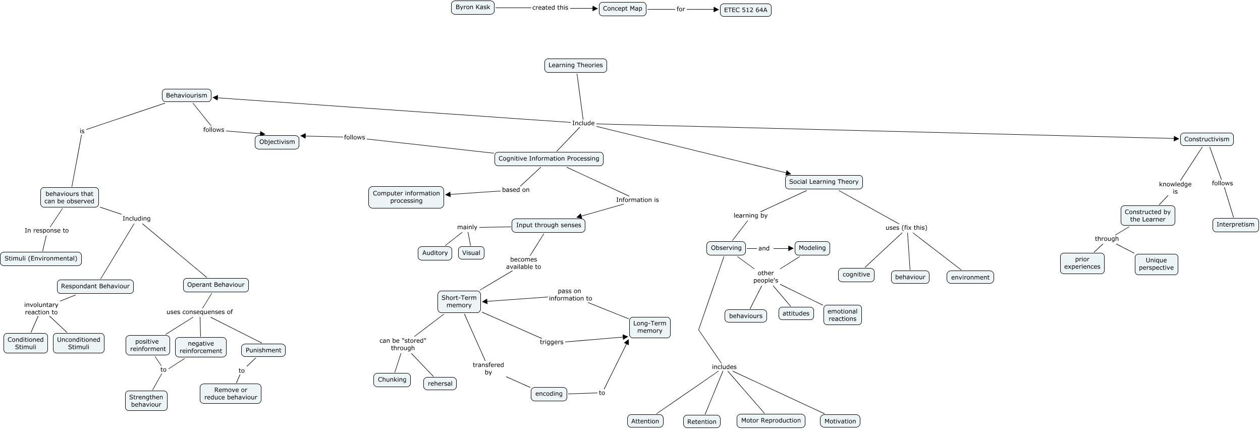 This Concept Map, created with IHMC CmapTools, has information related to: Byron Kask Learning Theories Snapshot Oct 1, 2008, Social Learning Theory uses (fix this) behaviour, Constructivism follows Interpretism, Operant Behaviour uses consequenses of positive reinforment, Short-Term memory triggers Long-Term memory, Cognitive Information Processing based on Computer information processing, Operant Behaviour uses consequenses of negative reinforcement, Modeling other people's emotional reactions, Input through senses mainly Auditory, Constructed by the Learner through prior experiences, negative reinforcement to Strengthen behaviour, Constructivism knowledge is Constructed by the Learner, Input through senses mainly Visual, Behaviourism is behaviours that can be observed, Modeling other people's attitudes, Short-Term memory can be "stored" through rehersal, Observing includes Motivation, Short-Term memory transfered by encoding, Learning Theories Include Constructivism, Observing other people's behaviours, Learning Theories Include Behaviourism