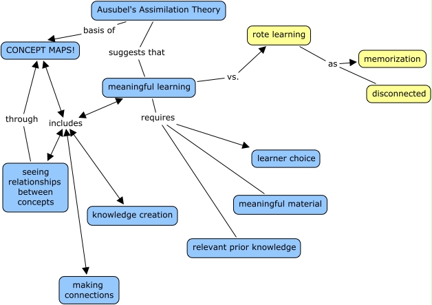 This Concept Map, created with IHMC CmapTools, has information related to: Assimilation Learning CMap, rote learning as memorization, Ausubel's Assimilation Theory basis of CONCEPT MAPS!, rote learning as disconnected, meaningful learning vs. rote learning, Ausubel's Assimilation Theory suggests that meaningful learning, seeing relationships between concepts through CONCEPT MAPS!, meaningful learning includes CONCEPT MAPS!, meaningful learning includes making connections, meaningful learning requires relevant prior knowledge, meaningful learning includes knowledge creation, meaningful learning requires learner choice, meaningful learning includes seeing relationships between concepts, meaningful learning requires meaningful material