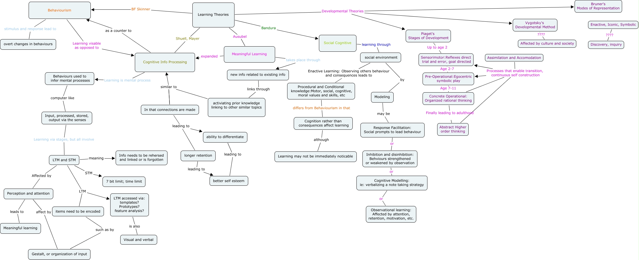 This Concept Map, created with IHMC CmapTools, has information related to: Learning Theories, LTM accessed via: templates? Prototypes? feature analysis? is also Visual and verbal, Learning Theories Developmental Theories Bruner's Modes of Representation, ability to differentiate leading to better self esteem, Learning Theories Ausubel Meaningful Learning, Learning Theories Developmental Theories Vygotsky's Developmental Method, Sensorimotor:Reflexes direct trial and error, goal directed Age 2-7 Pre-Operational:Egocentric symbolic play, Perception and attention leads to Meaningful learning, Meaningful Learning expanded Cognitive Info Processing, Pre-Operational:Egocentric symbolic play Age 7-11 Concrete Operational: Organized rational thinking, Assimilation and Accomodation Processes that enable transition, continuous self construction Pre-Operational:Egocentric symbolic play, longer retention leading to better self esteem, In that connections are made leading to longer retention, Input, processed, stored, output via the senses Learning via stages, but all involve LTM and STM, Behaviours used to infer mental processes computer like Input, processed, stored, output via the senses, Behaviourism stimulus and response lead to overt changes in behaviours, Inhibition and disinhibition: Behviours strengthened or weakened by observation or Cognitive Modelling: ie: verbalizing a note taking strategy, social environment by Modeling, Learning Theories Bandura Social Cognitive, Sensorimotor:Reflexes direct trial and error, goal directed Age 2-7 Pre-Operational:Egocentric symbolic play, activiating prior knowledge linking to other similar topics similar to Cognitive Info Processing