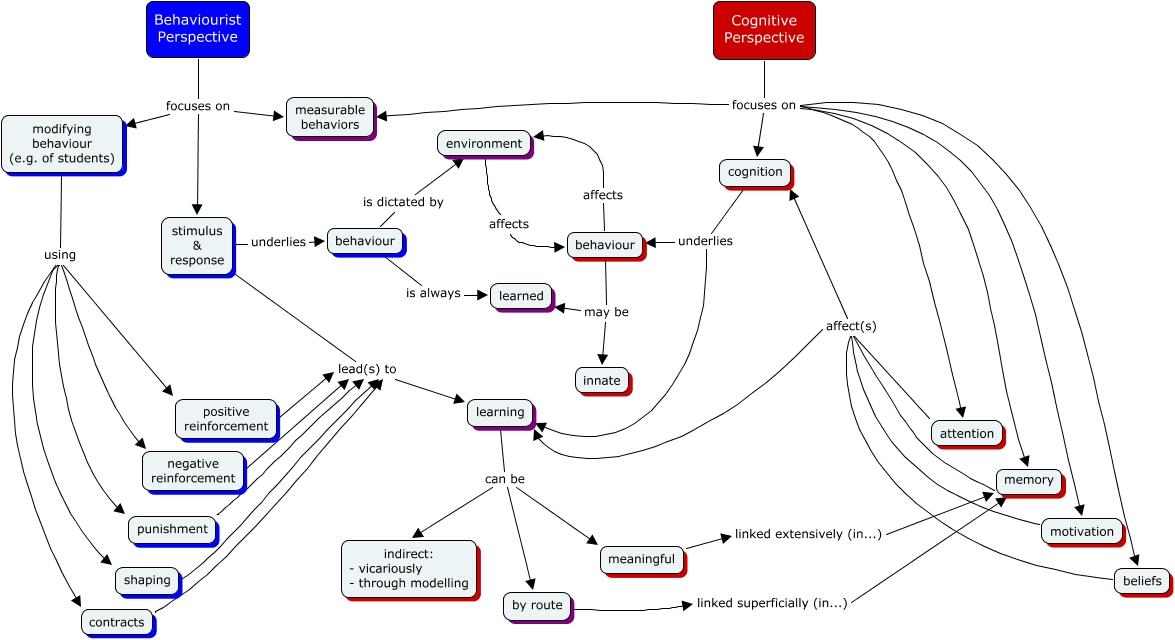 This Concept Map, created with IHMC CmapTools, has information related to: ETEC512-Drebot-draft1, learning can be by route, modifying behaviour (e.g. of students) using positive reinforcement, environment affects behaviour, attention affect(s) cognition, behaviour may be innate, stimulus & response underlies behaviour, Cognitive Perspective focuses on measurable behaviors, modifying behaviour (e.g. of students) using contracts, memory affect(s) cognition, cognition underlies learning, learning can be meaningful, Cognitive Perspective focuses on memory, Behaviourist Perspective focuses on stimulus & response, contracts lead(s) to learning, punishment lead(s) to learning, Cognitive Perspective focuses on attention, Cognitive Perspective focuses on cognition, by route linked superficially (in...) memory, positive reinforcement lead(s) to learning, meaningful linked extensively (in...) memory