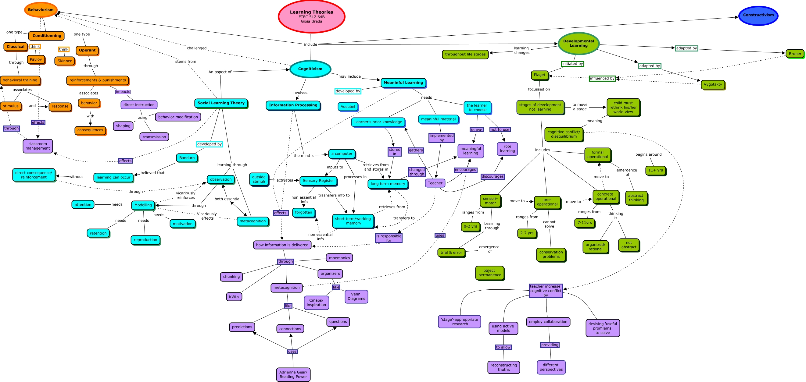 This Concept Map, created with IHMC CmapTools, has information related to: Gioia Breda ETEC 51264B, the learner to choose to use meaningful learning, Adrienne Gear/ Reading Power uses predictions, Behaviorism is Conditionning, formal operational emergence of abstract thinking, Modelling needs motivation, Vygotskty influenced by Piaget, direct consequence/ reinforcement through observation, observation through Modelling, how information is delivered through chunking, Modelling vicariously reinforces observation, Behaviorism effects classroom management, Cognitivism challenged Behaviorism, how information is delivered through metacognition, sensori- motor move to pre- operational, Developmental Learning learning changes throughout life stages, Teacher encourages meaningful learning, direct instruction using shaping, behavior with consequences, Learning Theories ETEC 512 64B Gioia Breda include Developmental Learning, Piaget focussed on stages of development not learning