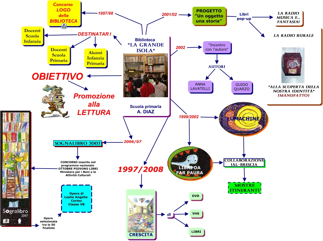 Questa Mappa Concettuale ha informazioni correlate a: Storia della biblioteca, Biblioteca "la grande isola" Scuola primaria A. DIAZ 1999/2002 LIBRI DA FAR PAURA, Biblioteca "la grande isola" Scuola primaria A. DIAZ DESTINATARI Docenti Scuola Primaria, "Incontro con l'autore" Autori GUIDO QUARZO, CRESCITA di LIBRI, Biblioteca "la grande isola" Scuola primaria A. DIAZ 2002 "Incontro con l'autore", LUMACHINE Collaborazione IAL-Brescia Mostre itineranti, CRESCITA di DVD, Biblioteca "la grande isola" Scuola primaria A. DIAZ OBIETTIVO Promozione alla LETTURA, CRESCITA di VHS, Biblioteca "la grande isola" Scuola primaria A. DIAZ 1997/98 Concorso LOGO della BIBLIOTECA