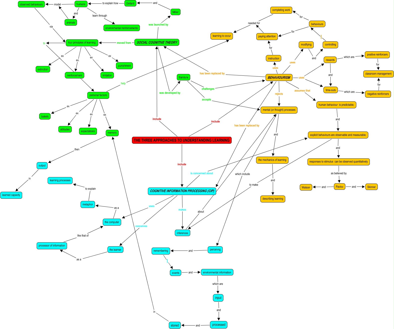 This Concept Map, created with IHMC CmapTools, has information related to: Draft 1, processor of information like that of the computer, BEHAVIOURISM uses rewards, THE THREE APPROACHES TO UNDERSTANDING LEARNING include BEHAVIOURISM, personal factors ex expectations, processed and stored, personal factors ex beliefs, Pavlov and Watson, explicit behaviours are observable and measurable; and responses to stimulus can be observed quantitatively, controlling behaviours, remembering events, four principles of learning: to personal factors, rewards and time-outs, metaphor to explain learning processes, Miller and Dollard, human behaviour is predictable; and explicit behaviours are observable and measurable;, BEHAVIOURISM has been replaced by SOCIAL COGNITIVE THEORY, SOCIAL COGNITIVE THEORY was developed by Bandura, negative reinforcers for classroom management, positive reinforcers for classroom management, BEHAVIOURISM uses instruction