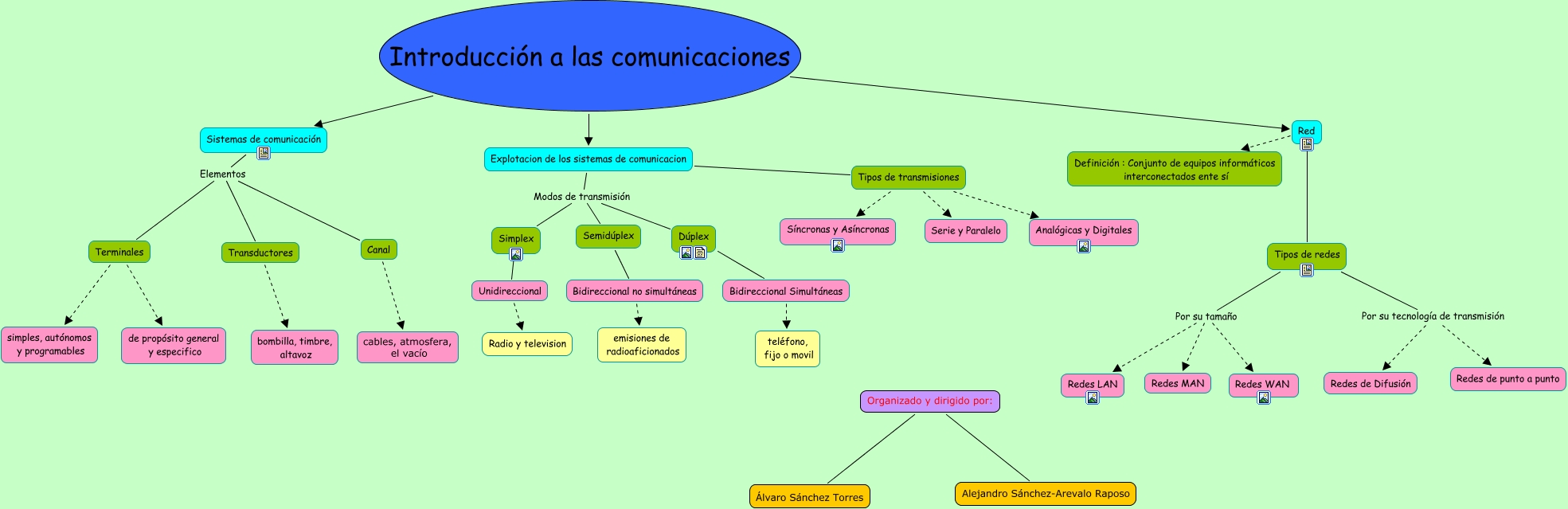 Este Cmap, tiene información relacionada con: Introduccion a las comunicaciones, Canal cables, atmosfera, el vacío, Terminales de propósito general y especifico, Simplex Unidireccional, Terminales simples, autónomos y programables, Introducción a las comunicaciones Red, Bidireccional no simultáneas emisiones de radioaficionados, Bidireccional Simultáneas teléfono, fijo o movil, Dúplex Bidireccional Simultáneas, Introducción a las comunicaciones Explotacion de los sistemas de comunicacion, Unidireccional Radio y television, Sistemas de comunicación Elementos Terminales, Explotacion de los sistemas de comunicacion Modos de transmisión Semidúplex, Tipos de redes Por su tecnología de transmisión Redes de punto a punto, Sistemas de comunicación Elementos Canal, Explotacion de los sistemas de comunicacion Tipos de transmisiones, Semidúplex Bidireccional no simultáneas, Tipos de transmisiones Síncronas y Asíncronas, Explotacion de los sistemas de comunicacion Modos de transmisión Dúplex, Organizado y dirigido por: Álvaro Sánchez Torres, Transductores bombilla, timbre, altavoz