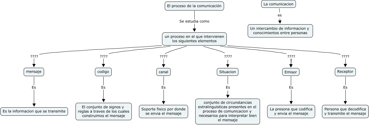 Este Cmap, tiene información relacionada con: La comunicacion, canal Es Soporte fisico por donde se envia el mensaje, El proceso de la comunicación Se estudia como un proceso en el que intervienen los siguientes elementos, un proceso en el que intervienen los siguientes elementos ???? Receptor, codigo Es El conjunto de signos y reglas a traves de los cuales construimos el mensaje, mensaje Es Es la informacion que se transmite, La comunicacion es Un intercambio de informacion y conocimientos entre personas, un proceso en el que intervienen los siguientes elementos ???? Emisor, Receptor Es Persona que decodifica y transmite el mensaje, un proceso en el que intervienen los siguientes elementos ???? mensaje, un proceso en el que intervienen los siguientes elementos ???? Situacion, un proceso en el que intervienen los siguientes elementos ???? codigo, un proceso en el que intervienen los siguientes elementos ???? canal, un proceso en el que intervienen los siguientes elementos ???? Emisor, Situacion Es conjunto de circunstancias extralinguisticas presentes en el proceso de comunicacion y necesarios para interpretar bien el mensaje, Emisor Es La presona que codifica y envia el mensaje