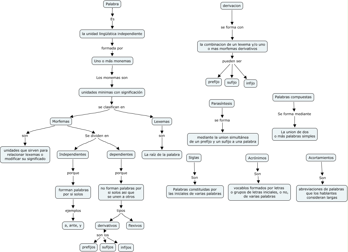 Este Cmap, tiene información relacionada con: Estructura de las palabras, derivativos son los prefijos, unidades minimas con significación se clasifican en Morfemas, Siglas Son Palabras constituidas por las iniciales de varias palabras, Acrónimos Son vocablos formados por letras o grupos de letras iniciales, o no, de varias palabras, la unidad lingüística independiente formada por Uno o más monemas, Palabra Es la unidad lingüística independiente, forrman palabras por si solos ejemplos a, ante, y, Lexemas son La raíz de la palabra, la combinacion de un lexema y/o uno o mas morfemas derivativos pueden ser sufijo, unidades minimas con significación se clasifican en Lexemas, Acortamientos Son abreviaciones de palabras que los hablantes consideran largas, Morfemas Se dividen en Independientes, derivativos son los sufijos, la combinacion de un lexema y/o uno o mas morfemas derivativos pueden ser prefijo, Independientes porque forrman palabras por si solos, la combinacion de un lexema y/o uno o mas morfemas derivativos pueden ser infijo, Uno o más monemas Los monemas son unidades minimas con significación, Morfemas son unidades que sirven para relacionar lexemas o modificar su significado, derivacion se forma con la combinacion de un lexema y/o uno o mas morfemas derivativos, derivativos son los infijos
