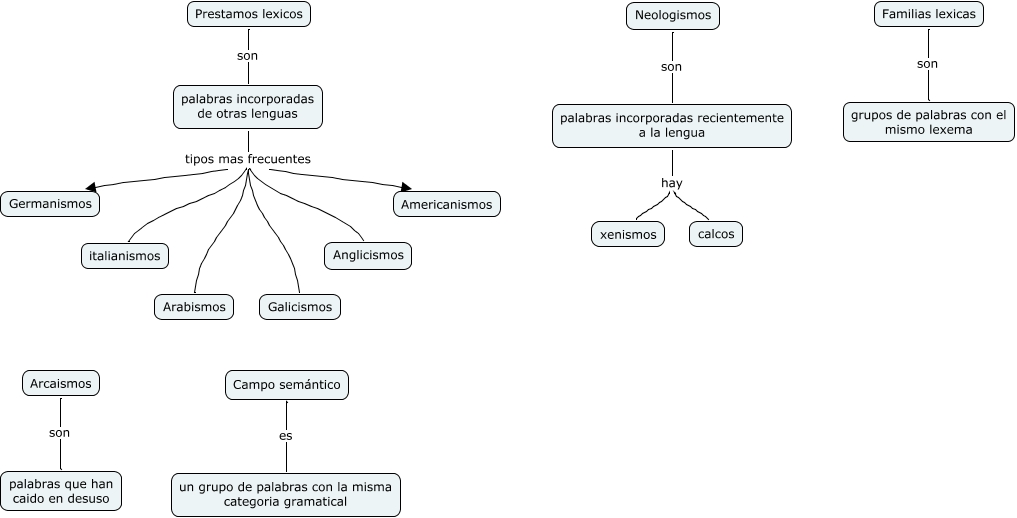 Este Cmap, tiene información relacionada con: Familias lexicas, prestamos, neologismos, arcaismos, campo semantico, palabras incorporadas de otras lenguas tipos mas frecuentes Germanismos, Prestamos lexicos son palabras incorporadas de otras lenguas, palabras incorporadas de otras lenguas tipos mas frecuentes Anglicismos, palabras incorporadas de otras lenguas tipos mas frecuentes Galicismos, palabras incorporadas recientemente a la lengua hay calcos, Campo semántico es un grupo de palabras con la misma categoria gramatical, Arcaismos son palabras que han caido en desuso, palabras incorporadas de otras lenguas tipos mas frecuentes italianismos, Familias lexicas son grupos de palabras con el mismo lexema, palabras incorporadas recientemente a la lengua hay xenismos, Neologismos son palabras incorporadas recientemente a la lengua, palabras incorporadas de otras lenguas tipos mas frecuentes Arabismos, palabras incorporadas de otras lenguas tipos mas frecuentes Americanismos