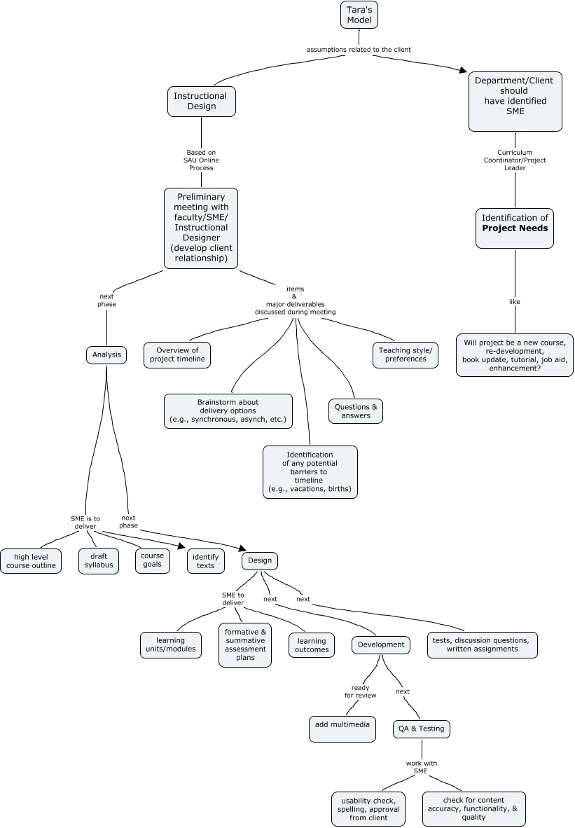 This Concept Map, created with IHMC CmapTools, has information related to: Tara's model, Preliminary meeting with faculty/SME/ Instructional Designer (develop client relationship) items & major deliverables discussed during meeting Overview of project timeline, Instructional Design Based on SAU Online Process Preliminary meeting with faculty/SME/ Instructional Designer (develop client relationship), Tara's Model assumptions related to the client Instructional Design, QA & Testing work with SME check for content accuracy, functionality, & quality, Preliminary meeting with faculty/SME/ Instructional Designer (develop client relationship) items & major deliverables discussed during meeting Questions & answers, Analysis SME is to deliver course goals, Design SME to deliver learning outcomes, Preliminary meeting with faculty/SME/ Instructional Designer (develop client relationship) items & major deliverables discussed during meeting Identification of any potential barriers to timeline (e.g., vacations, births), Preliminary meeting with faculty/SME/ Instructional Designer (develop client relationship) items & major deliverables discussed during meeting Teaching style/ preferences, Analysis SME is to deliver draft syllabus, Design next tests, discussion questions, written assignments, Design next Development, Identification of Project Needs like Will project be a new course, re-development, book update, tutorial, job aid, enhancement?, Development next QA & Testing, Analysis SME is to deliver identify texts, Analysis SME is to deliver high level course outline, Design SME to deliver learning units/modules, Analysis next phase Design, QA & Testing work with SME usability check, spelling, approval from client, Department/Client should have identified SME Curriculum Coordinator/Project Leader Identification of Project Needs
