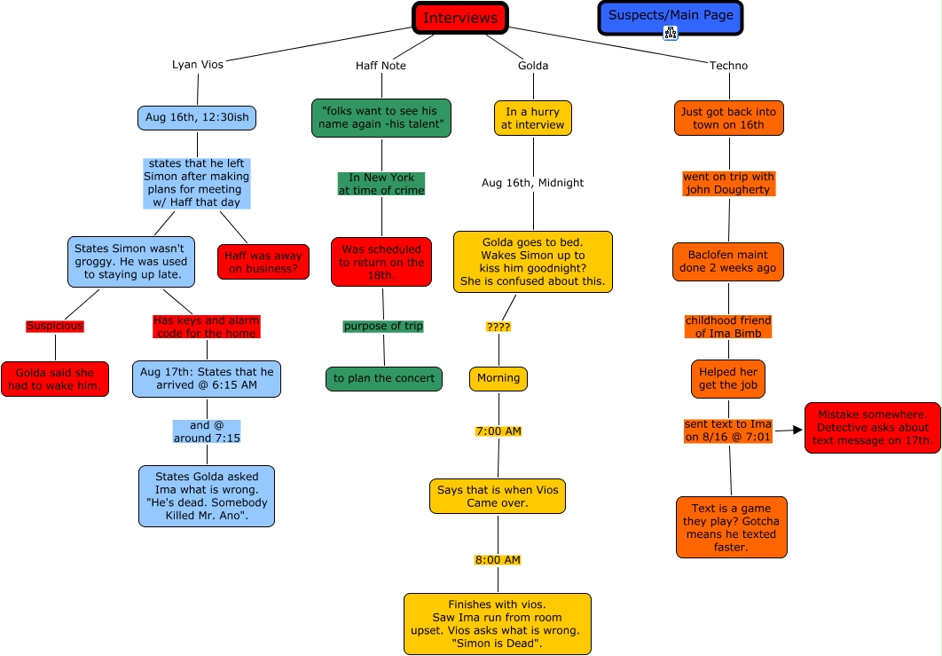 This Concept Map, created with IHMC CmapTools, has information related to: Interviews, Aug 17th: States that he arrived @ 6:15 AM and @ around 7:15 States Golda asked Ima what is wrong. "He's dead. Somebody Killed Mr. Ano"., States Simon wasn't groggy. He was used to staying up late. Has keys and alarm code for the home Aug 17th: States that he arrived @ 6:15 AM, Baclofen maint done 2 weeks ago childhood friend of Ima Bimb Helped her get the job, Morning 7:00 AM Says that is when Vios Came over., States Simon wasn't groggy. He was used to staying up late. Suspicious Golda said she had to wake him., Says that is when Vios Came over. 8:00 AM Finishes with vios. Saw Ima run from room upset. Vios asks what is wrong. "Simon is Dead"., Interviews Lyan Vios Aug 16th, 12:30ish, Aug 16th, 12:30ish states that he left Simon after making plans for meeting w/ Haff that day Haff was away on business?, Helped her get the job sent text to Ima on 8/16 @ 7:01 Mistake somewhere. Detective asks about text message on 17th., In a hurry at interview Aug 16th, Midnight Golda goes to bed. Wakes Simon up to kiss him goodnight? She is confused about this., Helped her get the job sent text to Ima on 8/16 @ 7:01 Text is a game they play? Gotcha means he texted faster., Interviews Haff Note "folks want to see his name again -his talent", Golda goes to bed. Wakes Simon up to kiss him goodnight? She is confused about this. ???? Morning, Was scheduled to return on the 18th. purpose of trip to plan the concert, Aug 16th, 12:30ish states that he left Simon after making plans for meeting w/ Haff that day States Simon wasn't groggy. He was used to staying up late., Just got back into town on 16th went on trip with john Dougherty Baclofen maint done 2 weeks ago, Interviews Techno Just got back into town on 16th, "folks want to see his name again -his talent" In New York at time of crime Was scheduled to return on the 18th., Interviews Golda In a hurry at interview