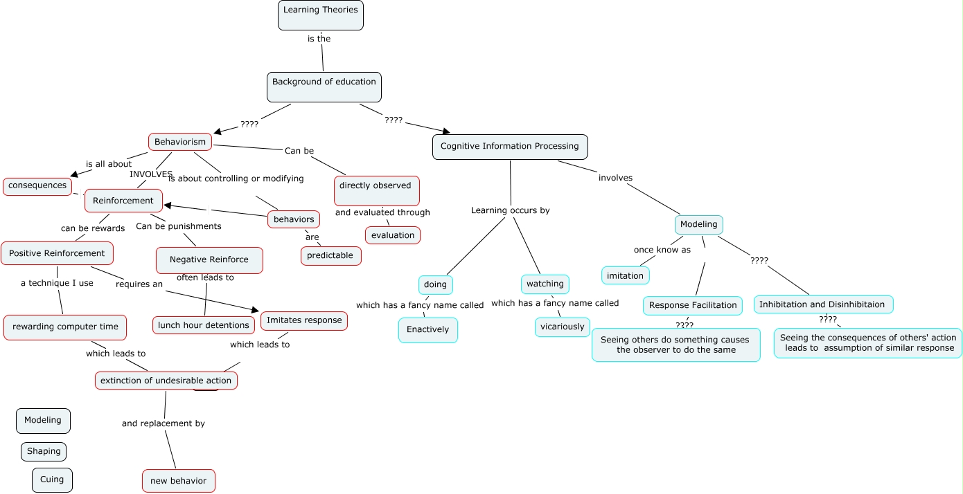 This Concept Map, created with IHMC CmapTools, has information related to: John Murray, Response Facilitation ???? Seeing others do something causes the observer to do the same, Behaviorism INVOLVES Reinforcement, Background of education ???? Cognitive Information Processing, Negative Reinforce often leads to lunch hour detentions, Imitates response which leads to ????, rewarding computer time which leads to extinction of undesirable action, doing which has a fancy name called Enactively, behaviors are predictable, directly observed and evaluated through evaluation, Positive Reinforcement a technique I use rewarding computer time, Modeling Response Facilitation, Modeling once know as imitation, behaviors Reinforcement, Positive Reinforcement requires an Imitates response, Behaviorism is all about consequences, Cognitive Information Processing Learning occurs by doing, Reinforcement can be rewards Positive Reinforcement, Reinforcement Can be punishments Negative Reinforce, consequences Reinforcement, extinction of undesirable action and replacement by new behavior