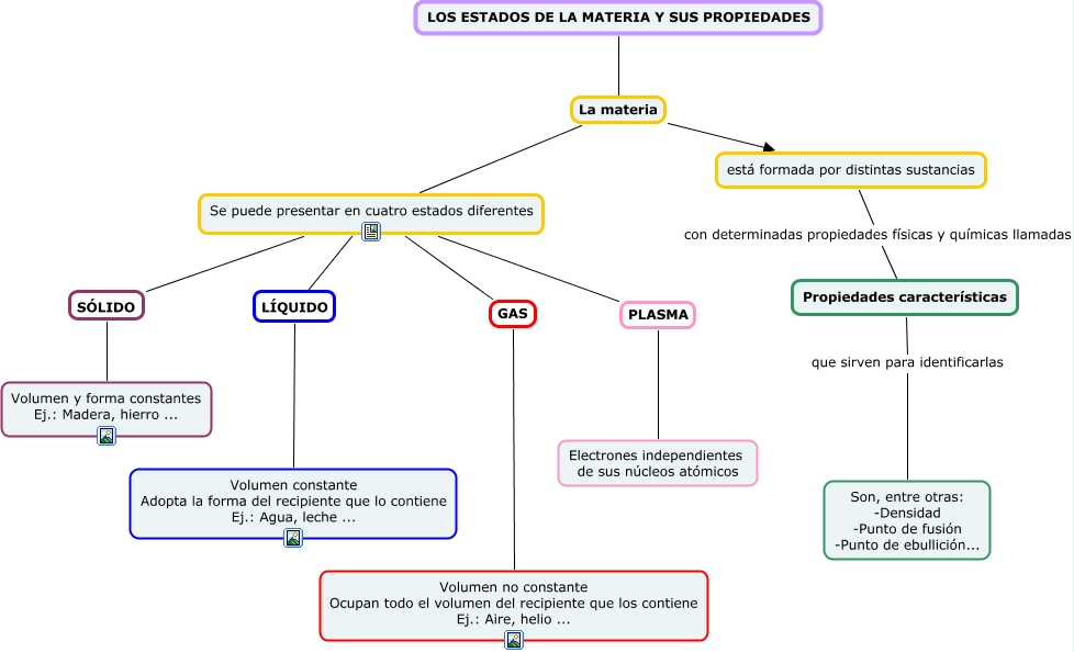 Este Cmap, tiene información relacionada con: 1 Estados de la materia y sus propiedades, Se puede presentar en cuatro estados diferentes LÍQUIDO Volumen constante Adopta la forma del recipiente que lo contiene Ej.: Agua, leche ..., Propiedades características que sirven para identificarlas Son, entre otras: -Densidad -Punto de fusión -Punto de ebullición..., está formada por distintas sustancias con determinadas propiedades físicas y químicas llamadas Propiedades características, LOS ESTADOS DE LA MATERIA Y SUS PROPIEDADES La materia Se puede presentar en cuatro estados diferentes, LOS ESTADOS DE LA MATERIA Y SUS PROPIEDADES La materia está formada por distintas sustancias, Se puede presentar en cuatro estados diferentes SÓLIDO Volumen y forma constantes Ej.: Madera, hierro ..., Se puede presentar en cuatro estados diferentes PLASMA Electrones independientes de sus núcleos atómicos, Se puede presentar en cuatro estados diferentes GAS Volumen no constante Ocupan todo el volumen del recipiente que los contiene Ej.: Aire, helio ...