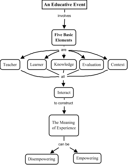 Esse mapa conceitual, produzido no IHMC CmapTools, tem a informação relacionada a: Five elements of ed - Novak, Context all Interact, Five Basic Elements are Knowledge, Five Basic Elements are Learner, The Meaning of Experience can be Empowering, The Meaning of Experience can be Disempowering, Five Basic Elements are Evaluation, Interact to construct The Meaning of Experience, Learner all Interact, An Educative Event involves Five Basic Elements, Knowledge all Interact, Five Basic Elements are Teacher, Evaluation all Interact, Teacher all Interact, Five Basic Elements are Context