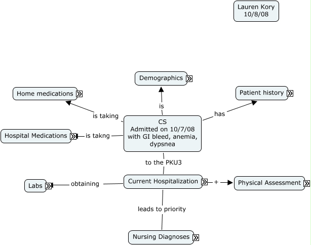 This Concept Map, created with IHMC CmapTools, has information related to: CMAP10-8-08, CS Admitted on 10/7/08 with GI bleed, anemia, dypsnea has Patient history, CS Admitted on 10/7/08 with GI bleed, anemia, dypsnea to the PKU3 Current Hospitalization, Current Hospitalization obtaining Labs, CS Admitted on 10/7/08 with GI bleed, anemia, dypsnea is takng Hospital Medications, CS Admitted on 10/7/08 with GI bleed, anemia, dypsnea is taking Home medications, CS Admitted on 10/7/08 with GI bleed, anemia, dypsnea is Demographics, Current Hospitalization leads to priority Nursing Diagnoses, Current Hospitalization + Physical Assessment