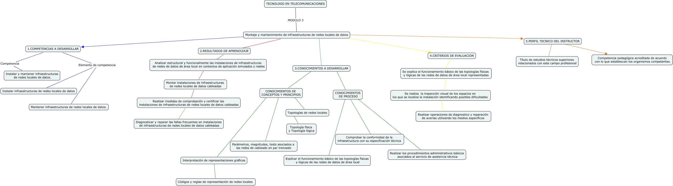 Este Cmap, tiene información relacionada con: Modulo 3, Se realiza la inspección visual de los espacios en los que se localiza la instalación identificando posibles dificultades ???? Realizar operaciones de diagnostico y reparación de averías utilizando los medios específicos, Interpretación de representaciones gráficas ???? Códigos y reglas de representación de redes locales, 1. COMPETENCIAS A DESARROLLAR Elemento de competencia Mantener infraestructuras de redes locales de datos., 1. COMPETENCIAS A DESARROLLAR Elemento de competencia Instalar infraestructuras de redes locales de datos, CONOCIMIENTOS DE PROCESO ???? Comprobar la conformidad de la infraestructura con su especificación técnica, CONOCIMIENTOS DE CONCEPTOS Y PRINCIPIOS ???? Parámetros, magnitudes, tests asociados a las redes de cableado en par trenzado, 1. COMPETENCIAS A DESARROLLAR Competencia Instalar y mantener infraestructuras de redes locales de datos., Montaje y mantenimiento de infraestructuras de redes locales de datos ???? 3. CONOCIMIENTOS A DESARROLLAR, 4. CRITERIOS DE EVALUACION ???? Se explica el funcionamiento básico de las topologías físicas y lógicas de las redes de datos de área local representadas, CONOCIMIENTOS DE PROCESO ???? Explicar el funcionamiento básico de las topologías físicas y lógicas de las redes de datos de área local, CONOCIMIENTOS DE CONCEPTOS Y PRINCIPIOS ???? Topologías de redes locales, CONOCIMIENTOS DE PROCESO ???? Realizar los procedimientos administrativos básicos asociados al servicio de asistencia técnica, Montar instalaciones de infraestructuras de redes locales de datos cableadas ???? Realizar medidas de comprobación y certificar las instalaciones de infraestructuras de redes locales de datos cableadas, Montaje y mantenimiento de infraestructuras de redes locales de datos ???? 1. COMPETENCIAS A DESARROLLAR, 3. CONOCIMIENTOS A DESARROLLAR ???? CONOCIMIENTOS DE PROCESO, Montaje y mantenimiento de infraestructuras de redes locales de datos ???? 4. CRITERIOS DE EVALUACION, CONOCIMIENTOS DE CONCEPTOS Y PRINCIPIOS ???? Interpretación de representaciones gráficas, TECNOLOGO EN TELECOMUNICACIONES MODULO 3 Montaje y mantenimiento de infraestructuras de redes locales de datos, 2. RESULTADOS DE APRENDIZAJE ???? Analizar estructural y funcionalmente las instalaciones de infraestructuras de redes de datos de área local en contextos de aplicación simulados o reales, Montaje y mantenimiento de infraestructuras de redes locales de datos ???? 2. RESULTADOS DE APRENDIZAJE