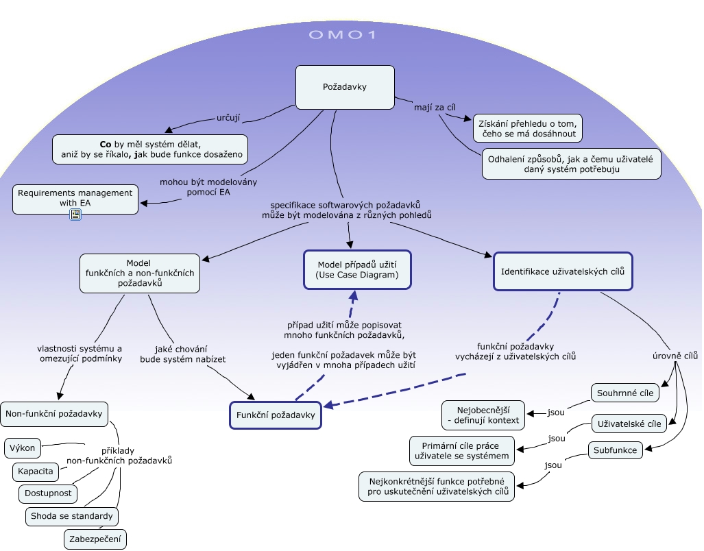 Tato Cmapa, vytvořená pomocí CmapTools, obsahuje informaci související s: Pozadavky, Non-funkční požadavky příklady non-funkčních požadavků Shoda se standardy, Požadavky specifikace softwarových požadavků může být modelována z různých pohledů Identifikace uživatelských cílů, Non-funkční požadavky příklady non-funkčních požadavků Kapacita, Uživatelské cíle jsou Primární cíle práce uživatele se systémem, Non-funkční požadavky příklady non-funkčních požadavků Výkon, Identifikace uživatelských cílů úrovně cílů Uživatelské cíle, Model funkčních a non-funkčních požadavků jaké chování bude systém nabízet Funkční požadavky, Požadavky specifikace softwarových požadavků může být modelována z různých pohledů Model funkčních a non-funkčních požadavků, Subfunkce jsou Nejkonkrétnější funkce potřebné pro uskutečnění uživatelských cílů, Model funkčních a non-funkčních požadavků vlastnosti systému a omezující podmínky Non-funkční požadavky, Požadavky mají za cíl Získání přehledu o tom, čeho se má dosáhnout, Požadavky specifikace softwarových požadavků může být modelována z různých pohledů Model případů užití (Use Case Diagram), Souhrnné cíle jsou Nejobecnější - definují kontext, Non-funkční požadavky příklady non-funkčních požadavků Zabezpečení, Funkční požadavky případ užití může popisovat mnoho funkčních požadavků, jeden funkční požadavek může být vyjádřen v mnoha případech užití Model případů užití (Use Case Diagram), Identifikace uživatelských cílů úrovně cílů Souhrnné cíle, Identifikace uživatelských cílů úrovně cílů Subfunkce, Požadavky mohou být modelovány pomocí EA Requirements management with EA, Non-funkční požadavky příklady non-funkčních požadavků Dostupnost, Požadavky určují Co by měl systém dělat, aniž by se říkalo, jak bude funkce dosaženo