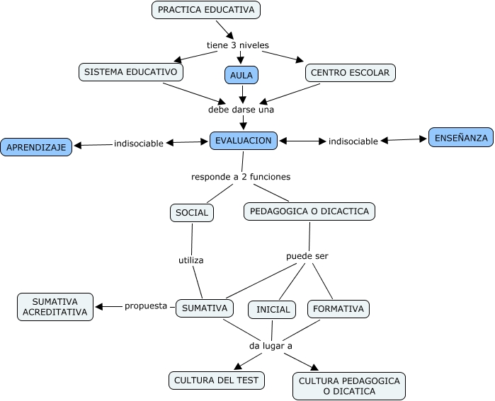 Este Cmap, tiene información relacionada con: MAPA DEL GRUPO, INICIAL da lugar a CULTURA DEL TEST, EVALUACION responde a 2 funciones SOCIAL, EVALUACION responde a 2 funciones PEDAGOGICA O DICACTICA, SUMATIVA propuesta SUMATIVA ACREDITATIVA, INICIAL da lugar a FORMATIVA, PEDAGOGICA O DICACTICA puede ser SUMATIVA, PRACTICA EDUCATIVA tiene 3 niveles CENTRO ESCOLAR, INICIAL da lugar a SUMATIVA, CENTRO ESCOLAR debe darse una EVALUACION, PEDAGOGICA O DICACTICA puede ser FORMATIVA, INICIAL da lugar a CULTURA PEDAGOGICA O DICATICA, EVALUACION indisociable ENSEÑANZA, EVALUACION indisociable APRENDIZAJE, SISTEMA EDUCATIVO debe darse una EVALUACION, PEDAGOGICA O DICACTICA puede ser INICIAL, PRACTICA EDUCATIVA tiene 3 niveles SISTEMA EDUCATIVO, PRACTICA EDUCATIVA tiene 3 niveles AULA, SOCIAL utiliza SUMATIVA, AULA debe darse una EVALUACION