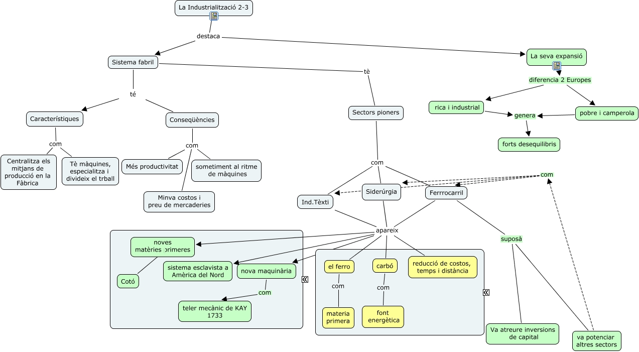 Este Cmap, tiene información relacionada con: La industrialització2-3, Sistema fabril tè Sectors pioners, Sistema fabril té Característiques, Conseqüències com sometiment al ritme de màquines, Ferrrocarril apareix noves matèries primeres, La Industrialització 2-3 destaca Sistema fabril, carbó com font energètica, Ind.Tèxti apareix carbó, Conseqüències com Minva costos i preu de mercaderies, noves matèries primeres Cotó, rica i industrial genera forts desequilibris, Ferrrocarril suposà va potenciar altres sectors, Siderúrgia apareix noves matèries primeres, Característiques com Centralitza els mitjans de producció en la Fàbrica, Siderúrgia apareix sistema esclavista a Amèrica del Nord, Ferrrocarril apareix sistema esclavista a Amèrica del Nord, Siderúrgia apareix carbó, Conseqüències com Més productivitat, pobre i camperola genera forts desequilibris, nova maquinària com teler mecànic de KAY 1733, La Industrialització 2-3 destaca La seva expansió